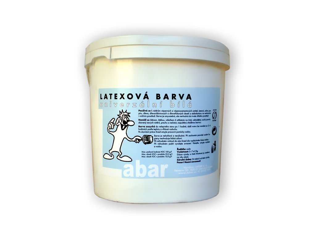 Univerzální latexová barva českého výrobce LABAR ve 27 barevných odstínech. Barva je určena k povrchové úpravě omítek, dřeva, sádrokartonů, kovů a dalších materiálů v interiéru i exteriéru. Barva je nehořlavá, ředidlem je voda a barva není jedovatá. Přesto není vhodná pro kontakt s hračkami, či potravinami. Vydatnost barvy je asi 5 – 7m2/kg/1vrstva dle savosti povrchu, nanášení štětcem, stříkáním, či máčením. Barva nesmí zamrznout! K dostání v balení 0,8 kg, 5 kg a bílá+černá i v balení 10 kg.