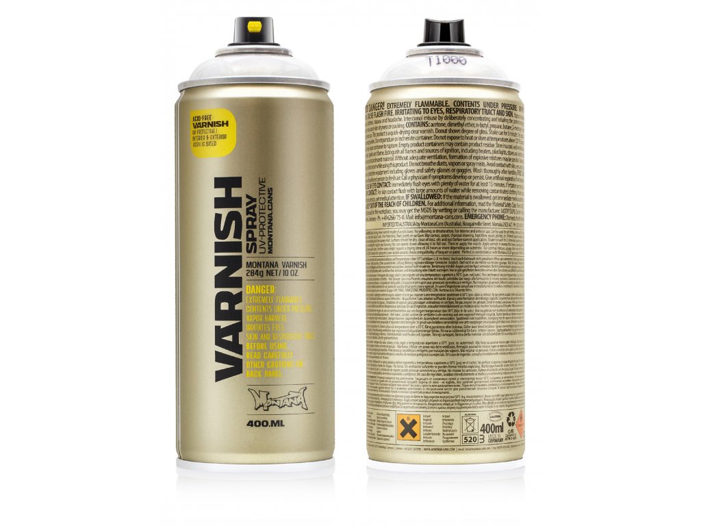 Jedná se o bezbarvý lak německého výrobce Montana pro ochranu lakovaného materiálu. Lak je na akrylové bázi a je 100% transparentní. Je možné ho použít na všechny typy povrchů a po velice rychlém zaschnutí vytváří ochrannou vrstvu, která výrazně napomáhá trvanlivosti nátěrů. Varnish se vyrábí ve variantě lesk, pololesk a mat. Po svém úplném zaschnutí nezanechává žádnou barevnou stopu a je bez desaturace. Působí jako ochrana nejen proti mechanickému poškození, ale i proti působení U. V. záření a dalším povětrnostním vlivům. Bezbarvé laky je nutné aplikovat až po úplném vyschnutí předešlé vrstvy barvy. Je vhodný i pro fixaci na plátně, nežloutne. Lze použít na plast, dřevo, kov, papír, beton, kůže a většinu dalších materiálů.