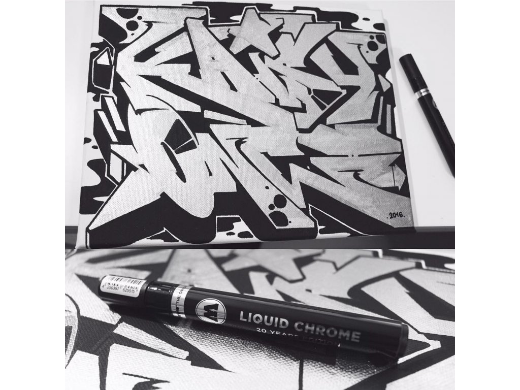 Fix s hrotem 2 mm německého výrobce Molotow a s jedinečnou náplní Liquid chrome, která vytváří souvislou, zrcadlově stříbrnou vrstvu. Náplň je produktem k 20. výročí a je výsledkem vývoje chromu řady Burner. Zrcadlový efekt je na trhu nepřekonatelný a barva odolává poškrábání a oděru. S hrotem šíře 2 mm je možné docílit jemných tahů a linek pro precizní a přesné práce. Barva perfektně kryje a po zaschnutí je vysoce lesklá. Díky opravdu silné koncentraci stříbrného pigmentu je barva velice kontrastní, zejména na tmavých materiálech a nepropouští světlo. Fix je vybaven optimalizovaným ventilem pro plynulou distribuci barvy do hrotu a vyniká svojí vysokou spolehlivostí. Fix je možné opakovaně naplnit, či k němu dokoupit náhradní hrot. Fixy této řady lze použít jak v interiéru, tak v exteriéru, kde je pro vyšší odolnost doporučujeme zafixovat bezbarvým lakem. Kompatibilitu s lakem vyzkoušejte na méně viditelném místě, či na testovacím vzorku. Některé laky mohou způsobit ztrátu lesku náplně.