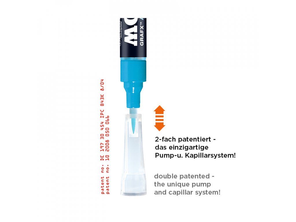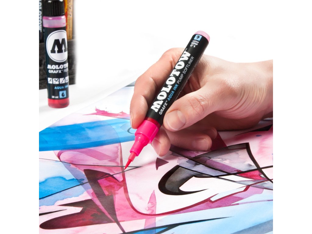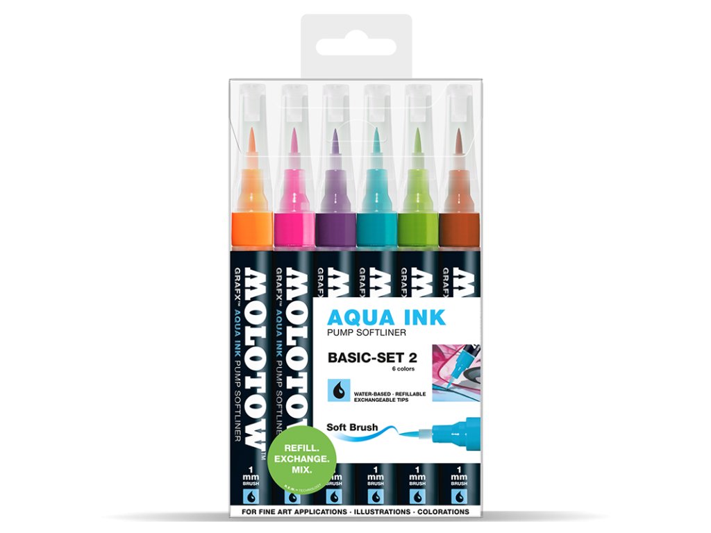 Nové fixy MOLOTOW GRAFX AQUA INK PUMP SOFTLINER na vodní bázi zaujmou strukturově stabilním elastickým štětcovým hrotem a jedinečným pumpovacím systémem distribuce barvy. Barevně intenzivní inkoust, který je transparentní, rozpustitelný vodou (např. pro akvarel), rychleschnoucí a bez zápachu. Fixy jdou samozřejmě znovu naplnit, a jsou k dispozici i náhradní hroty. Sada obsahuje 6 barevných odstínů. Systém vláken pro konstantní distribuci inkoustu, takže stopa je rozměrově stabilní + jemný pružný štětcový hrot pro precizní a komfortní aplikaci.