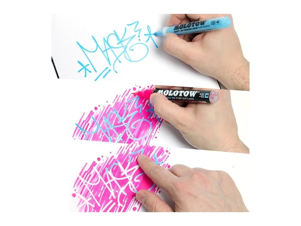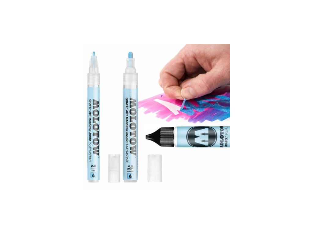 Maskovací fix německé značky Molotow s hrotem 4 mm. Umožňuje maskování bez zanechání jakýchkoliv zbytků. Nakreslete přesné linky s tímto popisovačem připraveným k okamžitému použití a vymaskované bílé obrysy, či mezery se stanou viditelnými téměř na všech površích. Kreslení přes uschlou maskovací tekutinu je tedy možné téměř se všemi inkousty a barvami na bázi akrylu, vody nebo alkoholu. Uschlou tekutinu je možné sloupnout, či odrolit beze zbytků, či zabarvení. Masking Liquid může být odstraněn bez zbytků po dobou dvou dnů po vyschnutí. Díky svým vlastnostem je skvělý nejen pro umělce, ale i kutily a modeláře.