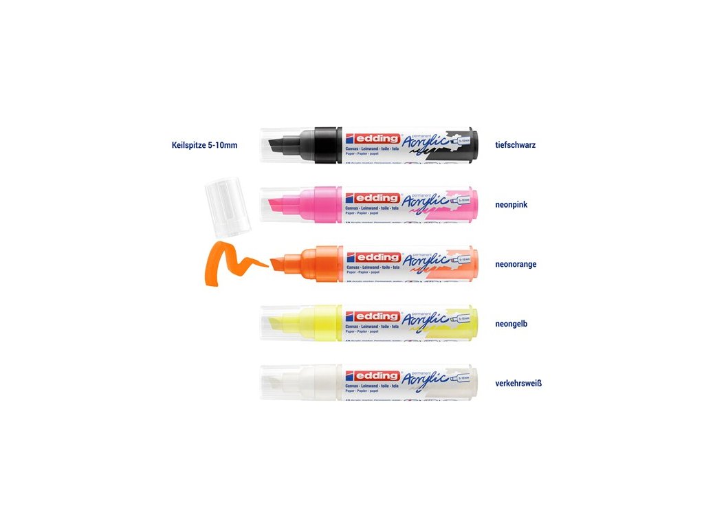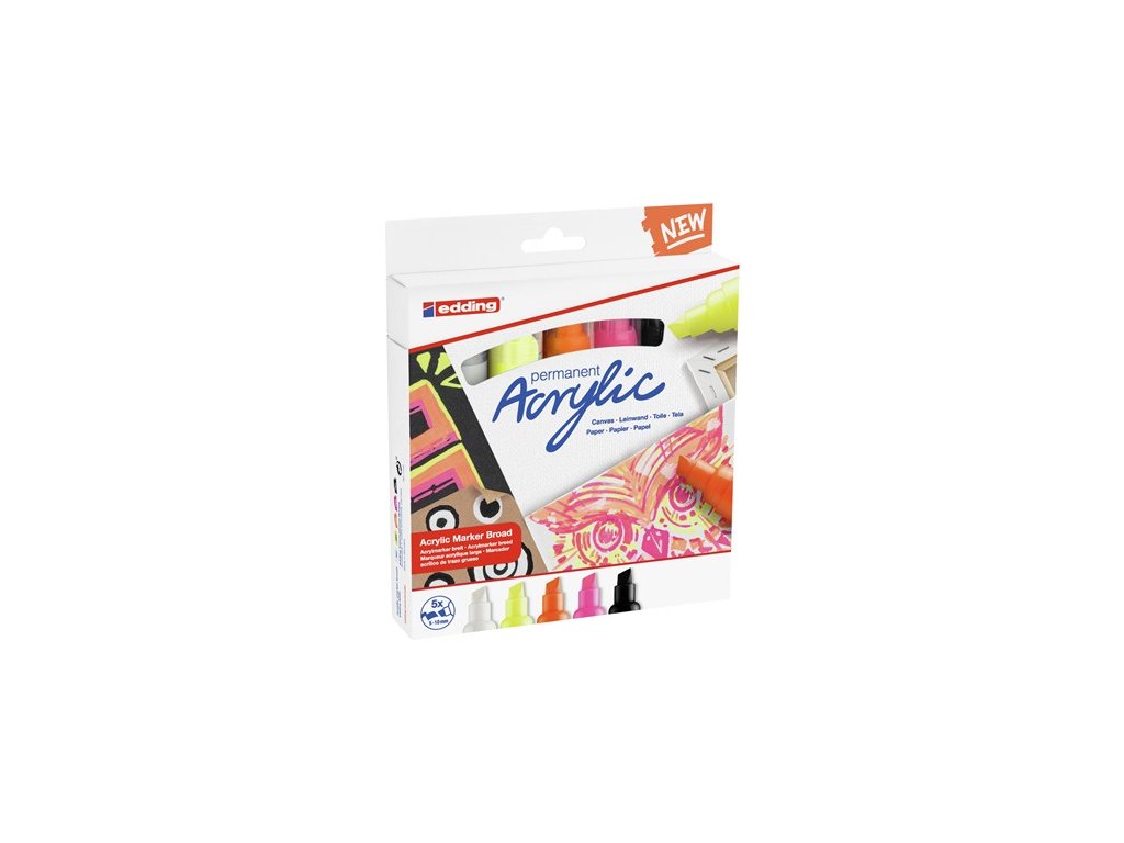Akrylový popisovač německého výrobce Edding s hrotem šíře 10 mm. Fix má zkosený hrot a obsahuje vysoce kvalitní pigmentovanou akrylovou barvu na bázi vody, která je po zaschnutí permanentní, neprůhledná, světlostálá a bez zápachu.. Popisovač je vhodný pro značení na většině materiálů v interiéru, i exteriéru na materiály jako plátno, sklo, plast, dřevo, kov, papír a další. Díky 10 mm hrotu je fixem možné docílit silnějších tahů a širších linek. Po zaschnutí je barva matná na principu laku. Ventilový systém umožňuje rovnoměrný tok barvy pro rozsáhlé pokrytí plochy. Sada obsahuje neonovou žlutou, oranžovou a růžovou + černou a bílou barvu.