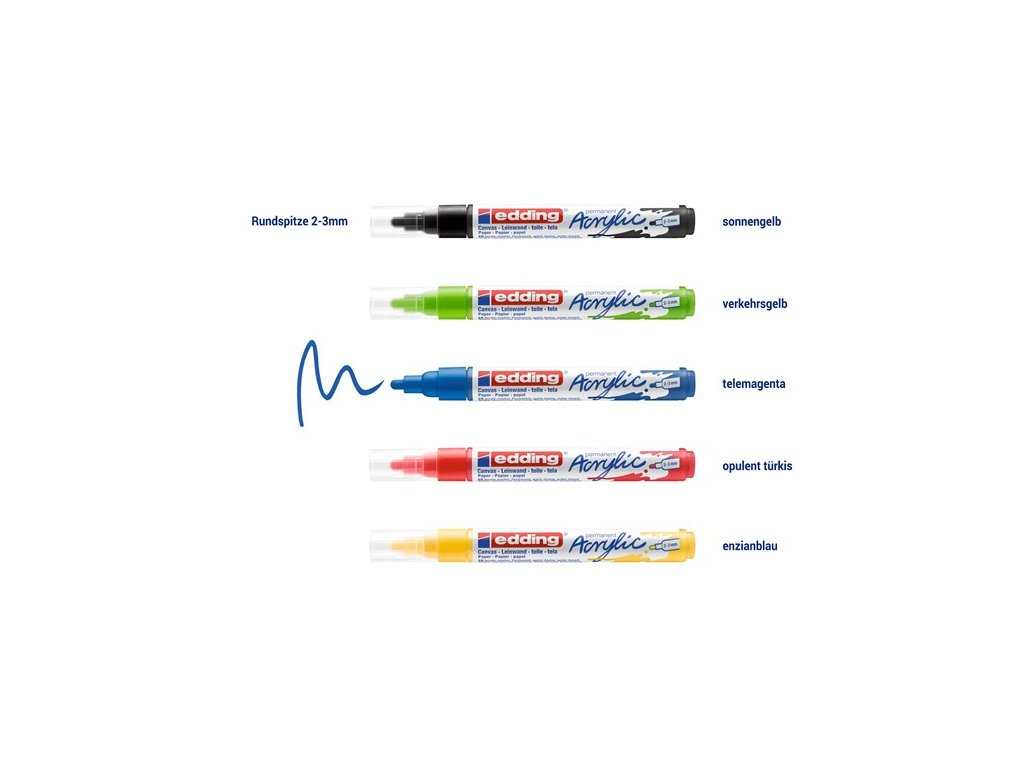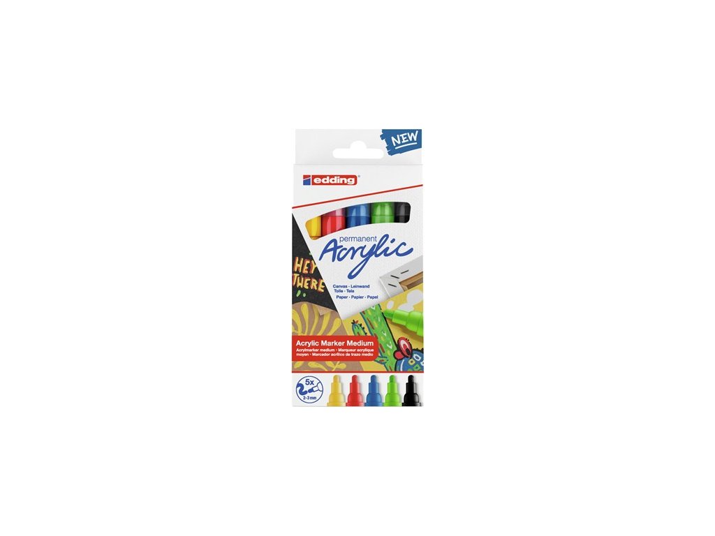 Akrylový popisovač německého výrobce Edding s hrotem šíře 4 mm. Fix má kulatý hrot a obsahuje vysoce kvalitní pigmentovanou akrylovou barvu na bázi vody, která je po zaschnutí permanentní, neprůhledná, světlostálá a bez zápachu.. Popisovač je vhodný pro značení na většině materiálů v interiéru, i exteriéru na materiály jako plátno, sklo, plast, dřevo, kov, papír a další. Díky 4 mm hrotu je fixem možné docílit silnějších tahů a jemných linek. Po zaschnutí je barva matná na principu laku. Ventilový systém umožňuje rovnoměrný tok barvy pro rozsáhlé pokrytí plochy. Sada obsahuje žlutou, červenou, zelenou, černou a modrou barvu.