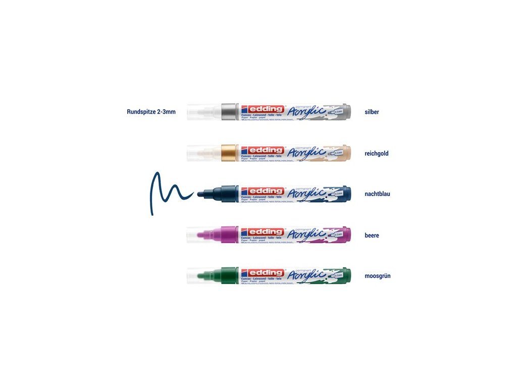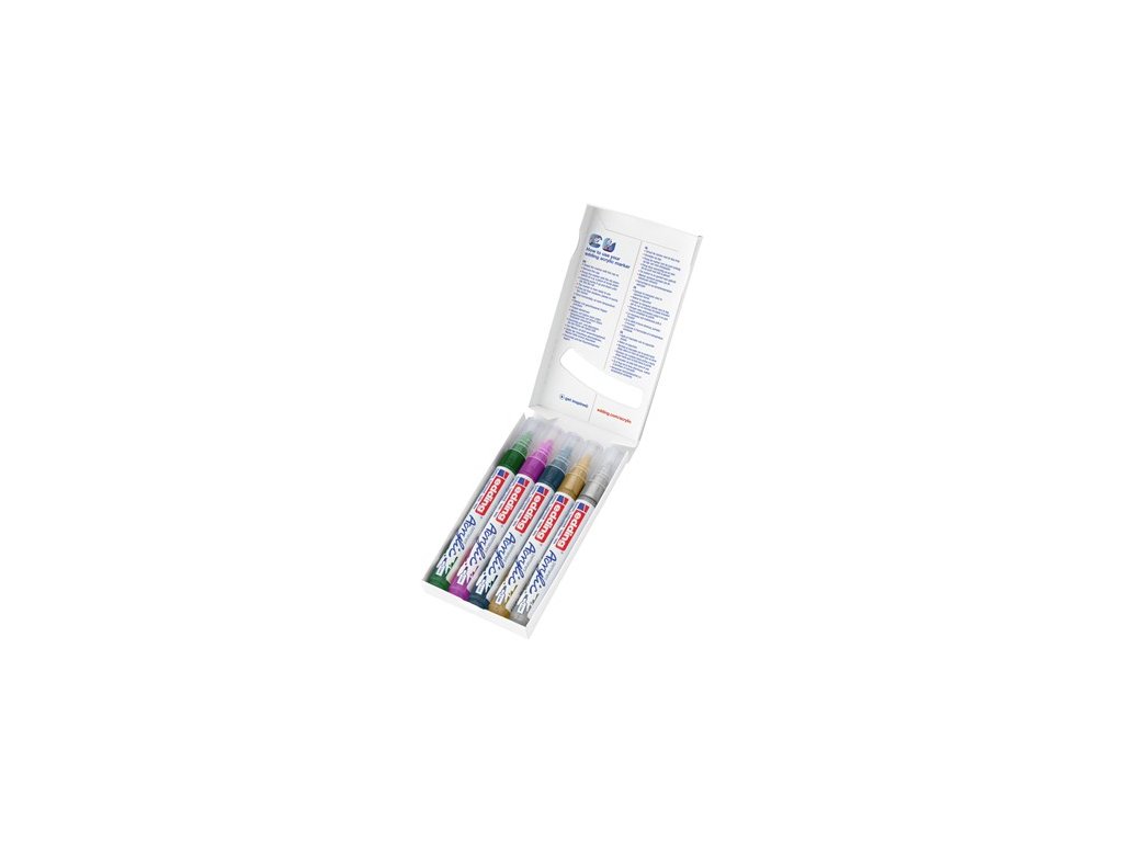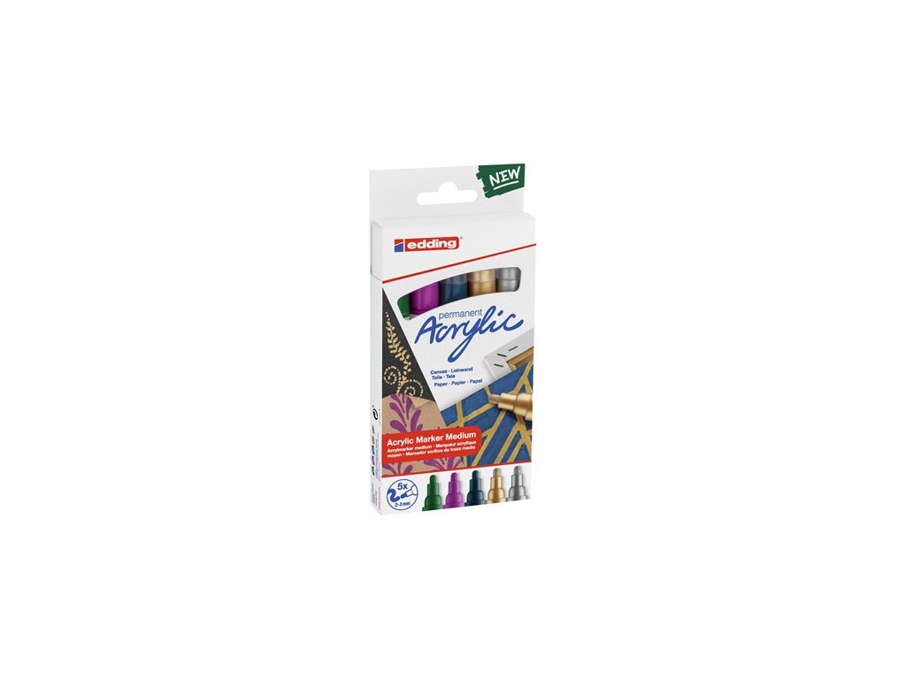 Akrylový popisovač německého výrobce Edding s hrotem šíře 4 mm. Fix má kulatý hrot a obsahuje vysoce kvalitní pigmentovanou akrylovou barvu na bázi vody, která je po zaschnutí permanentní, neprůhledná, světlostálá a bez zápachu. Popisovač je vhodný pro značení na většině materiálů v interiéru, i exteriéru na materiály jako plátno, sklo, plast, dřevo, kov, papír a další. Díky 4 mm hrotu je fixem možné docílit silnějších tahů a jemných linek. Po zaschnutí je barva matná na principu laku. Ventilový systém umožňuje rovnoměrný tok barvy pro rozsáhlé pokrytí plochy. Sada obsahuje stříbrnou, zlatou, metalickou zelenou, fialovou a modrou barvu.