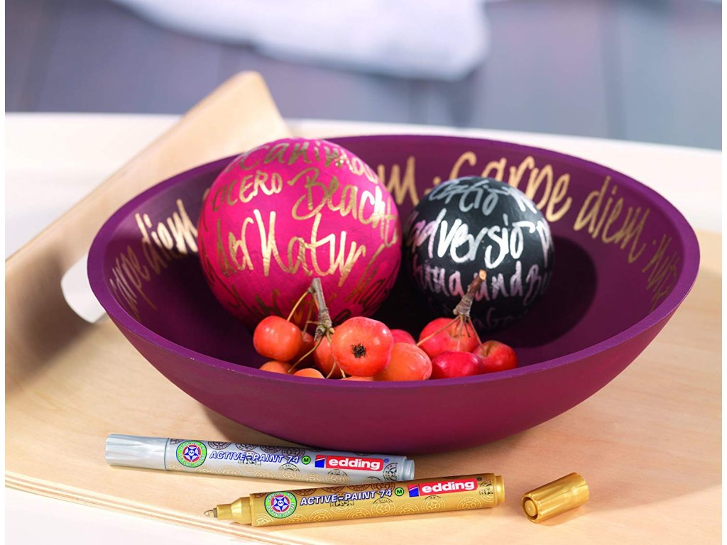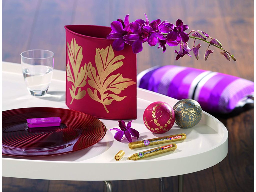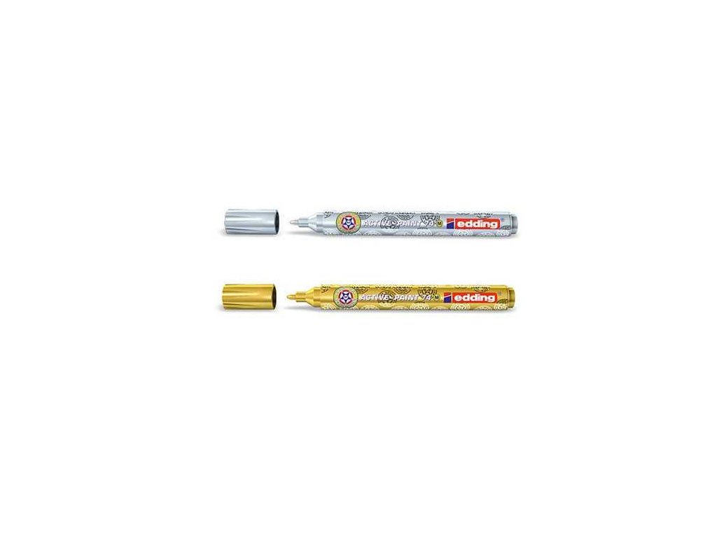 Lakový dekorativní popisovač německého výrobce Edding s hrotem šíře 4 mm. Fix v plastovém těle je vybaven inkoustem na alkoholové bázi s pigmentem, který má dobré krycí vlastnosti, je vodě a otěru vzdorný. Popisovač pro dekoraci je k dispozici ve variantě zlatá a stříbrná. Popisovač je vhodný pro značení na většině materiálů v interiéru, i exteriéru. Inkoust neobsahuje toluen a xylen, je rychleschnoucí, se slabým zápachem a má výbornou přilnavost k většině matriálů, jak hladkých, tak i porézních (sklo, plast, dřevo, kov, papír). Díky 2 mm hrotu, je fixem možné docílit slabých a tenkých tahů. Po zaschnutí je barva lesklá. Fix je možné opětovně doplnit náhradní náplní a vyměnit hrot.