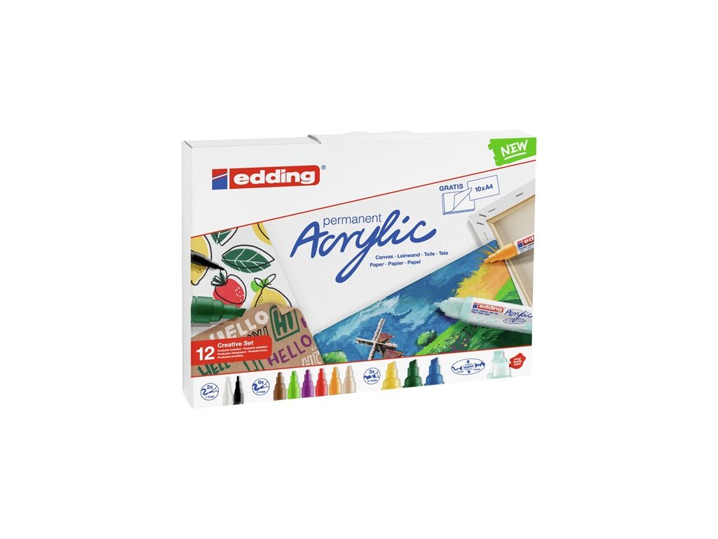 Kompletní sada produktů Edding z řady Acrylic. Sada obsahuje fixy s hrotem 2mm, fixy s kulatým hrotem 4 mm i se zkoseným hrotem 10 mm. Navíc sada obsahuje speciální aplikátor s objemem 45 ml barvy a oboustranným systémem aplikace. Průtok barvy je regulován mačkáním na měkké tělo tuby. Na jedné straně tuby je úzká aplikační špička a na druhé straně je široký plochý aplikátor. Vše obsahuje vysoce kvalitní pigmentovanou akrylovou barvu na bázi vody, která je po zaschnutí permanentní, neprůhledná, světlostálá a bez zápachu. Barva je vhodná pro značení na většině materiálů v interiéru, i exteriéru na materiály jako plátno, sklo, plast, dřevo, kov, papír a další. Po zaschnutí je barva matná na principu laku.