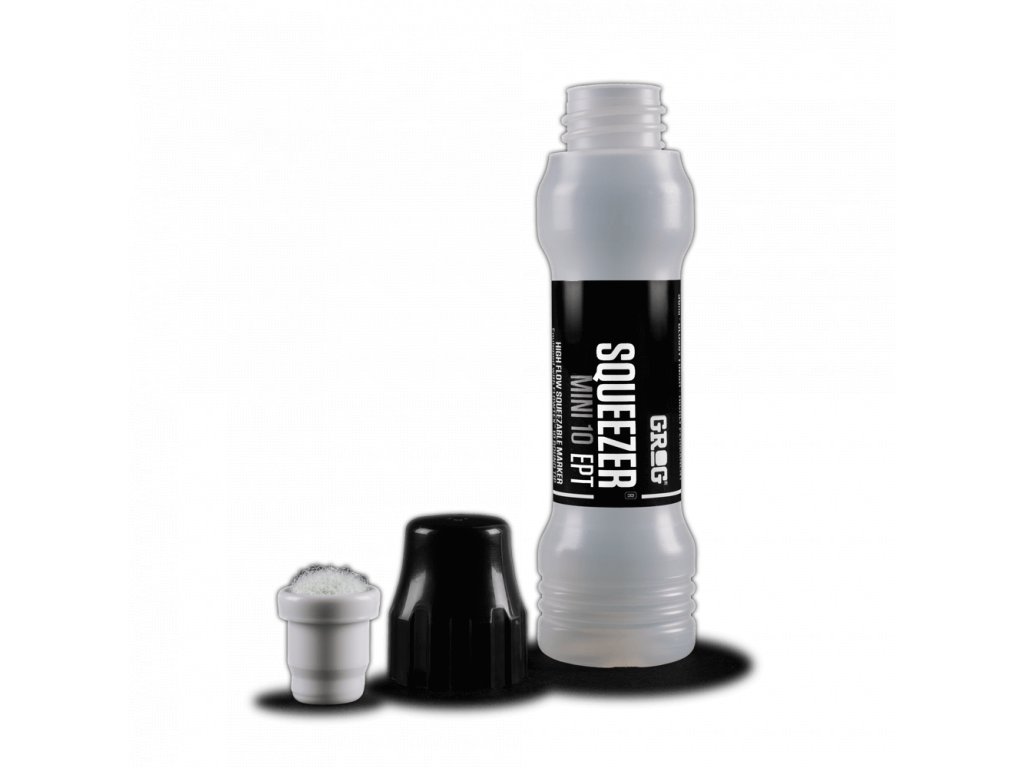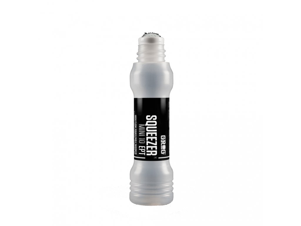 Zkrácený, prázdný squeezer italského výrobce Grog se středním hrotem šíře 10 mm. Tělo squeezeru je z velice měkkého plastu, čímž je umožněna regulace průtoku barvy hrotem. Doporučujeme psát na jemné a čisté povrchy. Squeezer je vybaven uzavíracím systémem pro ochranu před odkapávající barvou a tzv. antidrip okrajem. Objem náplně v tomto zkráceném squeezeru je 35 ml.