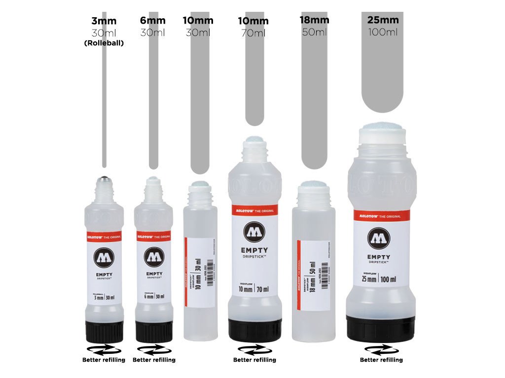 Prázdný squeezer německého výrobce Molotow s hrotem 6 mm. Objem těla je 30ml, squeezer je možné opakovaně naplnit a lze u něj vyměnit hrot. Tělo je z měkkého plastu a umožňuje dobrou kontrolu nad množstvím propouštěné barvy hrotem. Squeezer je možné doplňovat jak náplněmi na akrylové, tak lihové bázi. Díky malému hrotu je squeezer vhodný na menší práce na hladkém povrchu. Velikost squeezeru je velice kompaktní.
