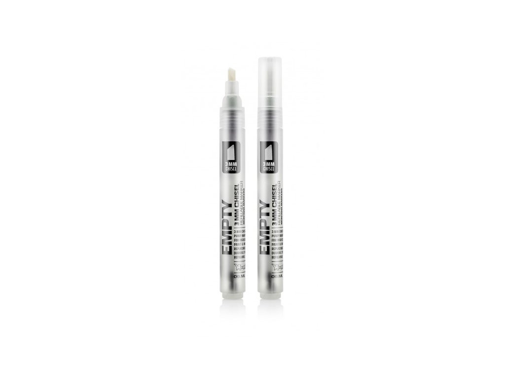 Prázdný fix německého výrobce Montana se zkoseným hrotem šíře 3 mm. Díky tenké stopě fixu je možné docílit velice přesných tahů a precizních prací. Fix je možné opakovaně naplnit, či k němu dokoupit náhradní hrot..