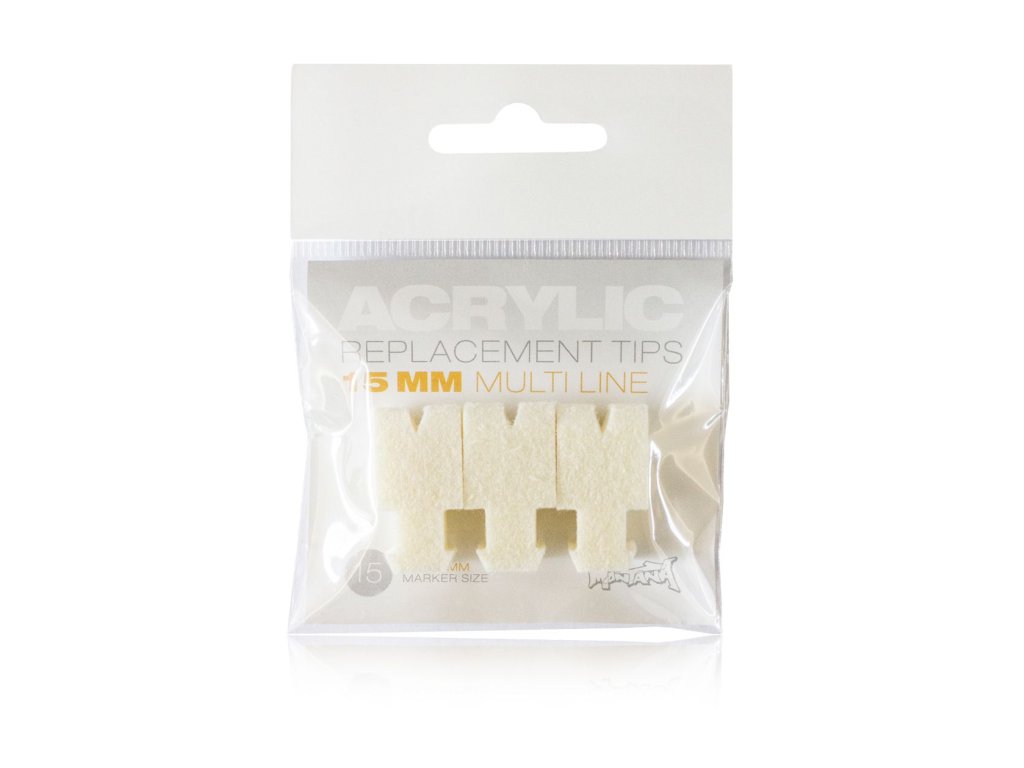 Náhradní hroty pro fixy s šířkou 15 mm, který vytváří dvojitou stopu. Kompatibilní s fixami Montana Acrylic. Hrot je vhodný pro všechny druhy náplní - na lihové, akrylové i lakové bázi. Balení obsahuje 3 ks hrotů.