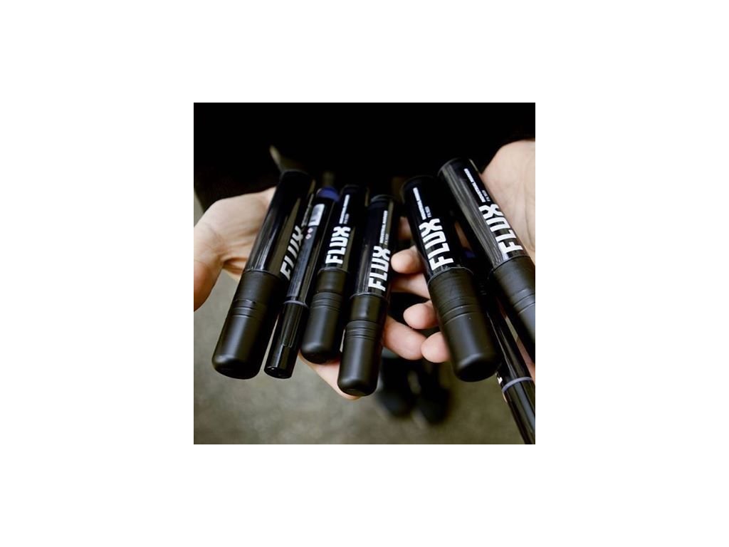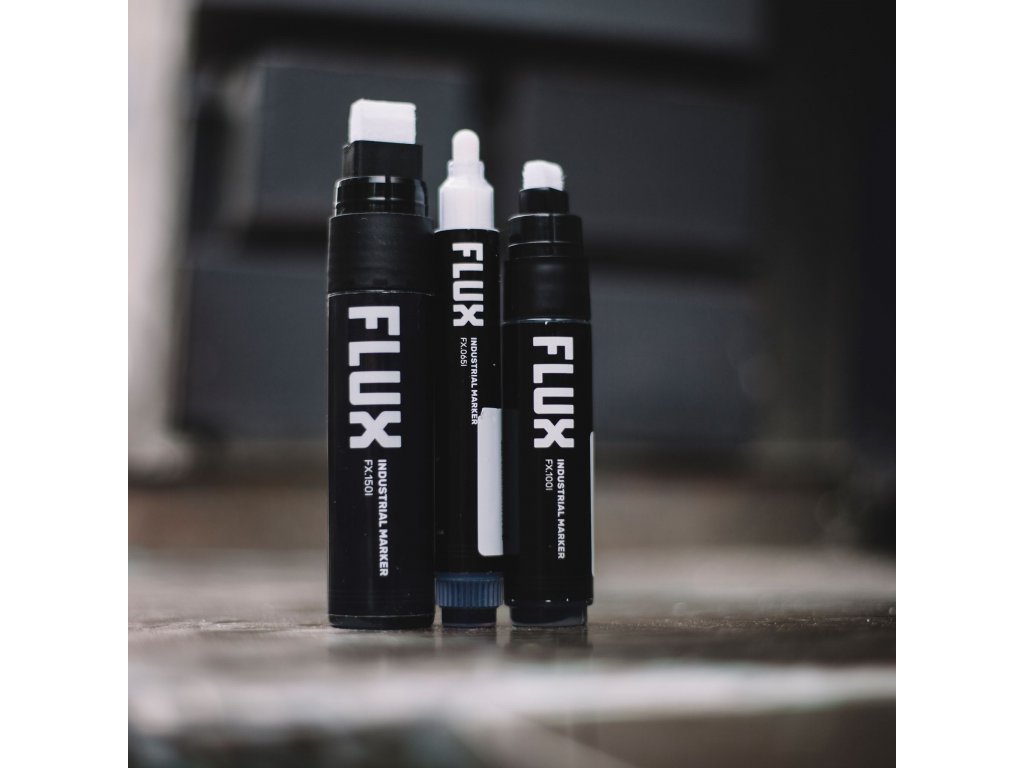 Flux industrial markers je značka speciálních, extrémně odolných fixů pro průmyslové využití. Černý inkoust se silně vsaje do materiálu na který je nanesen a je velmi těžko odstranitelný.