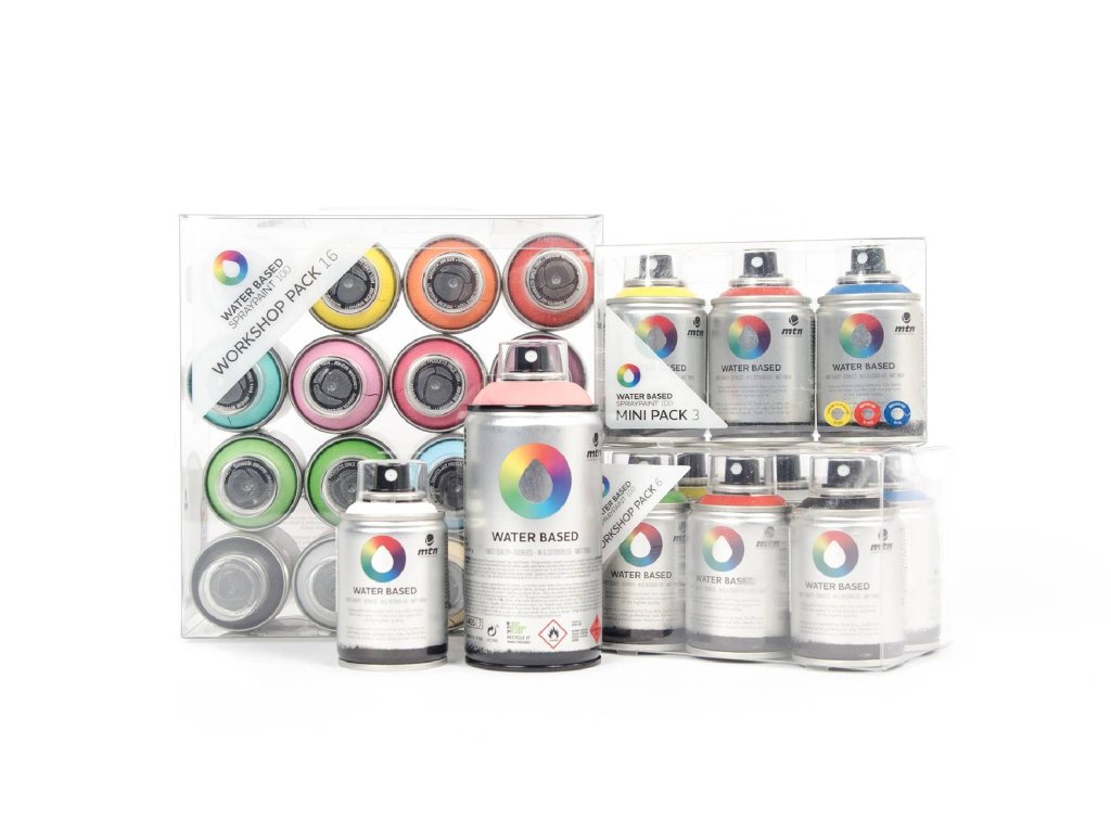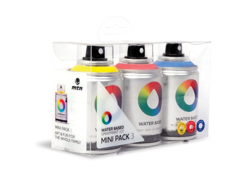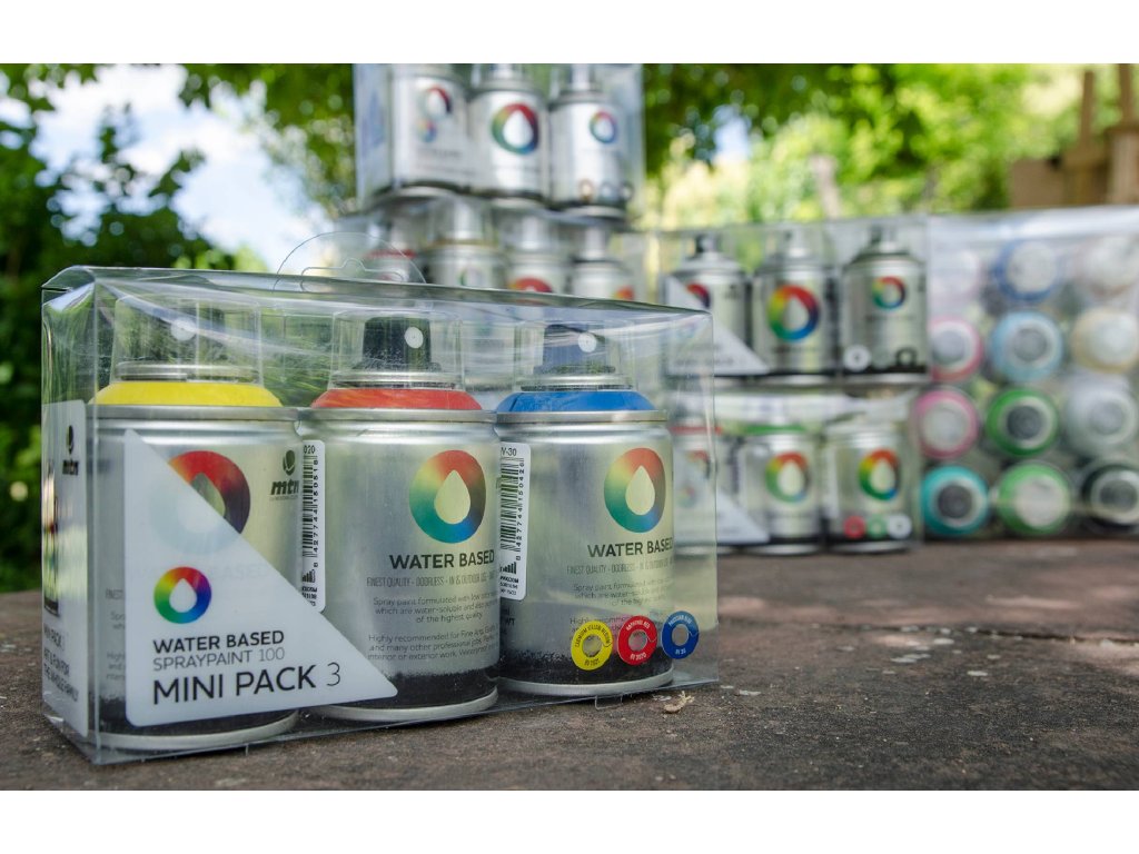 Spreje řady Water Based španělského výrobce MTN jsou výjimečné svými vlastnostmi, neboť mají výborné krycí vlastnosti, skvělou funkčnost a díky vodní bázi jsou téměř bez zápachu. Spreje obsahují asi 1% ředidla, díky čemuž velice rychle schnou a mimo interiér je možné je použít i ve venkovních podmínkách. Spreje mají nízký tlak a nabízí 87 matných odstínů, stříbrnou a zlatou. Díky nízkému tlaku a kompaktnějšímu balení jsou spreje vhodné pro práci s dětmi, ovšem při dodržení všech bezpečnostních opatření. Na spreje lze nasadit jakoukoliv trysku pro docílení požadované tloušťky stopy. Lze použít na plast, dřevo, kov, papír, beton, kůže a většinu dalších materiálů. Pro zajištění dlouhodobého svěžího vzhledu a pro zvýšení odolnosti doporučujeme barvu zalakovat bezbarvým lakem.