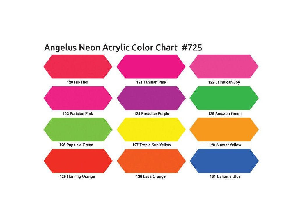 Angelus akrylové barvy pro použití na kůži, koženku, textil a další průzné materiály. Barvy jsou neprůhledné a ředitelné vodou, čímž se stávají průhlednější. Barvy jsou z řady neonových odstínů a pod UV světlem jsou aktivní, tedy svítí,