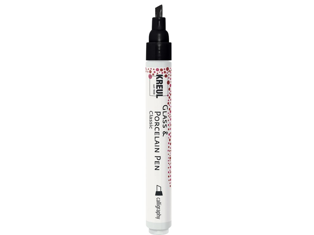 Fixy na sklo, keramiku a porcelán německé značky Kreul. Fix má zkosený hrot 4 mm, pumpovací systém pro distribuci barvy do hrotu. Doba schnutí nejméně 4 hodiny, případně 90 min v kuchyňské troubě při 160°C. Po vytvrzení je možné mýt v myčce.