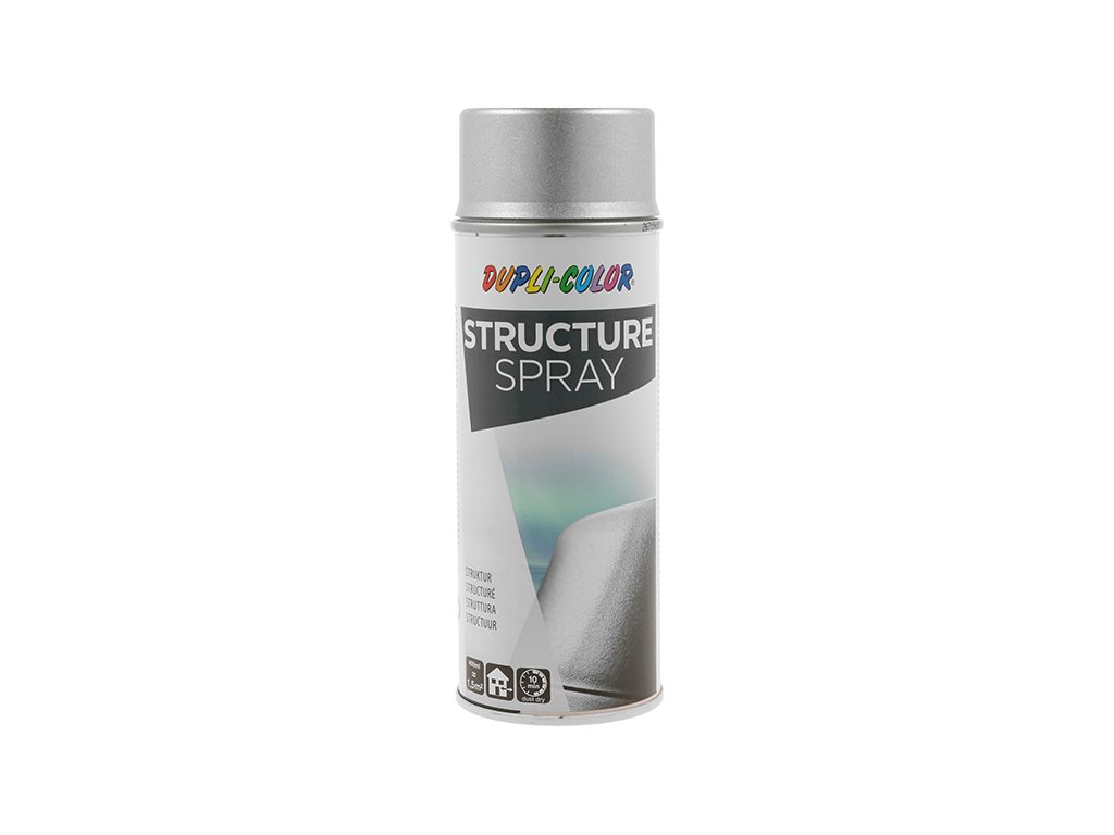 Sprej značky Dupli color v objemu 400 ml, který vytváří vzhled hrubé struktury v různých barevných odstínech (stříbrá, černá, antracitová). Structure efekt je vhodný pro přizpůsobení všech druhů části auta a pro opravy a restrukturalizaci opravených resp. vyplněných plastů. Po zaschnutí je možné strukturární sprej přelakovat jakýmkoliv akrylovým lakem, či barvou. Vhodný pro domácí dekorace a ruční práce na kov, dřevo, sklo, kámen, keramiku, lepenku a většinu tvrdých plastů.