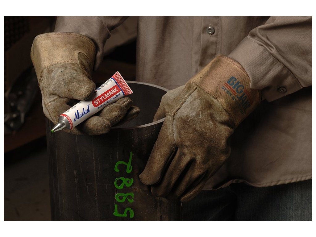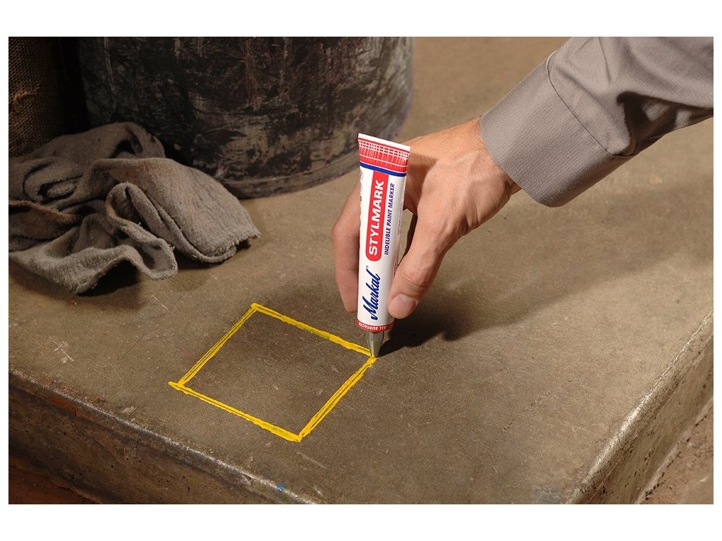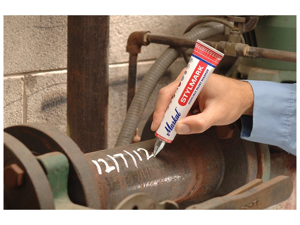 Markal Stylmark je popisovač s kovovou kuličkovou špičkou pro značení na většině površích. Hliníková tuba obsahuje hustou, syntetickou barvu, která umožňuje aplikaci na hrubé, vertikální povrchy a na strop. Má vynikající přilnavost na olejové a vlhké povrchy. Pigment má dobré krycí vlastnosti a je vhodný na téměř všechny materiály od plastů, přes kov, porcelán, sklo, dřevo, papír, či kůži. Díky hrotu s 6 mm stopou je možné docílit silnějších tahů. Náplň je bez obsahu xylenu. Díky extra odolné receptuře je popisovač velmi stálý a tedy vhodný pro průmyslové využití. Rozmezí značení: -20°C až 70°C, maximální teplota odolnosti značení: 200°C.