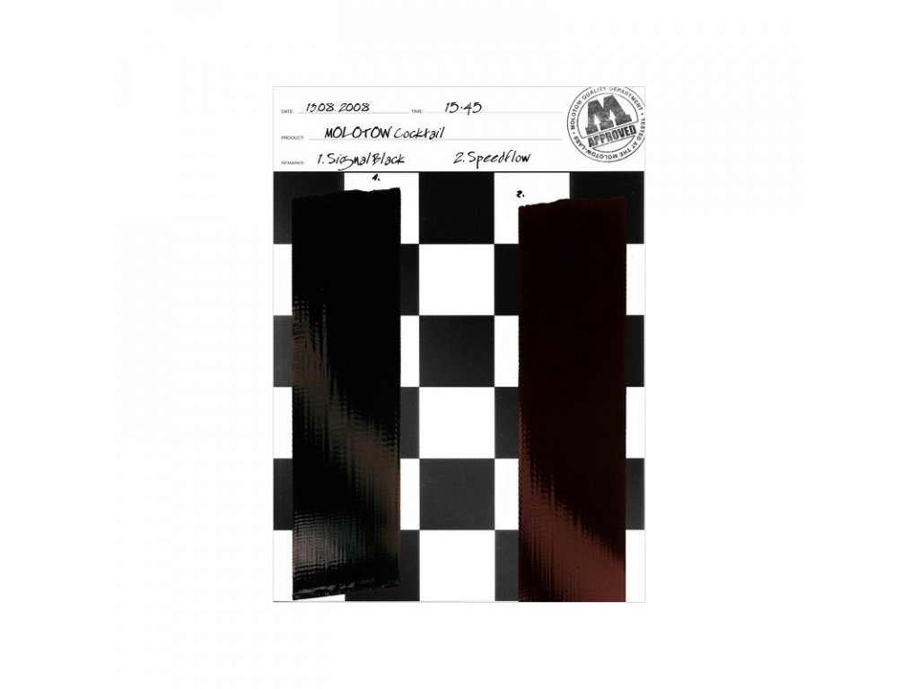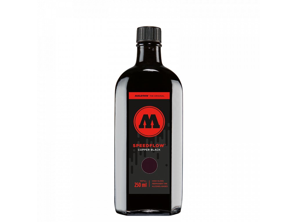 Náplň německého výrobce Molotow v objemu 250ml. Náplň je lihová, pigment má velice dobré krycí vlastnosti a je vhodný na téměř všechny materiály od plastů, přes kov, porcelán, sklo, dřevo a další materiály. Speedflow je černá s lehkým měděným odstínem, která vytváří metalickou černou stopu po zaschnutí je lesklá, vodě a oděru odolná. Díky opravdu vysoké koncentraci černého pigmentu je stopa velice kontrastní.
