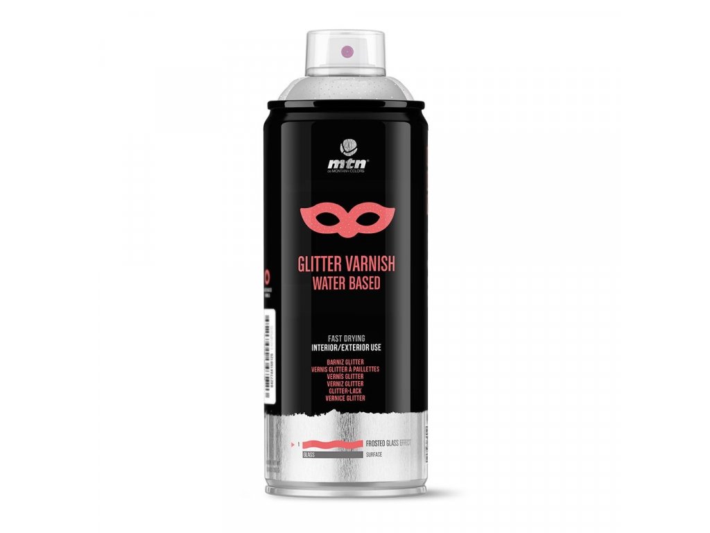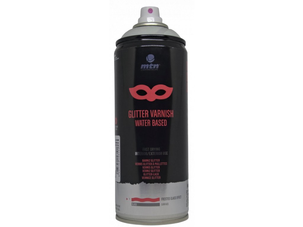 Efektový sprej MTN Glitter varnish je rychleschnoucí třpytivý lak. Vytváří transparentní ochrannou vrstvu s obsahem třpytek, jejichž intenzitu lze regulovat počtem nanesených vrstev. Lak je na vodní bázi a je možné ho použít na železo, ocel, plast, dřevo i expandovaný polystyren. Díky nízkému zápachu jej doporučujeme používat v interiéru a ve špatně větraných prostorách. K dispozici ve variantě stříbrná, zlatá a mnohobarevná, holografická třpytka.