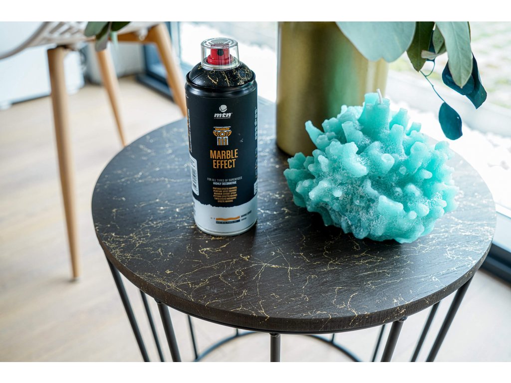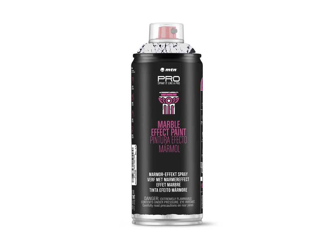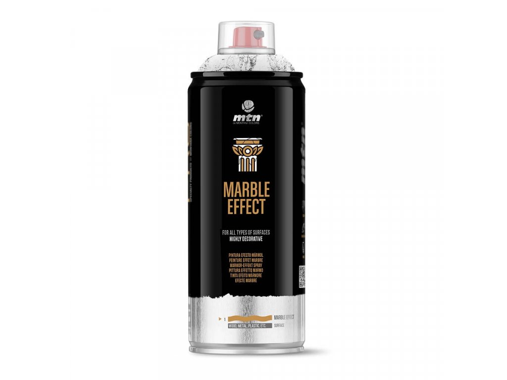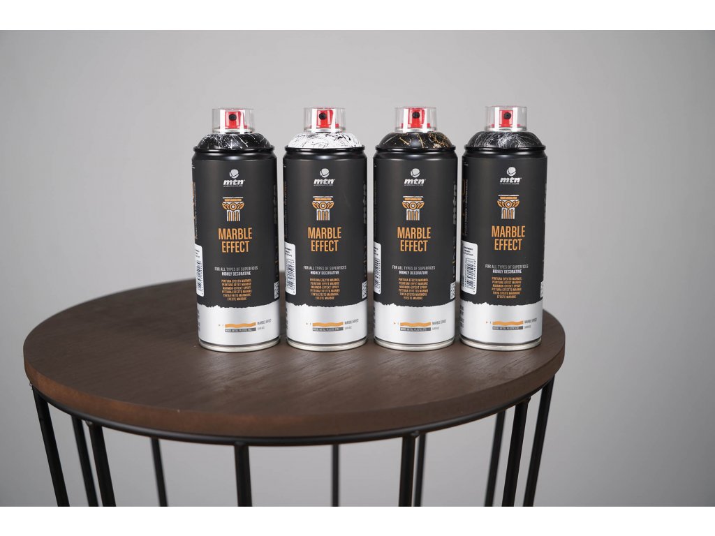 Barva MTN PRO Marble effect je dekorativní barva ve spreji na bázi akrylového rozpouštědla, která propůjčuje mramorový vzhled všem druhům povrchů. K dispozici jsou 4 barevné varianty a díky svým vlastnostem může být barva aplikována na kov, většinu plastů, kámen, keramiku, sklo a další předem natřené povrchy. Barva má vynikající krycí schopnost a na povrch dopadají jemné nitě barevného laku, což simuluje „žíly“ mramoru. Pro zlepšení přilnavosti doporučujeme v závislosti na povrchu nanést speciální základní nátěr. Tento produkt je ideální pro interiéry i exteriéry - v tom případě je vhodné použít akrylový lak MTN PRO ke zvýšení odolnosti.