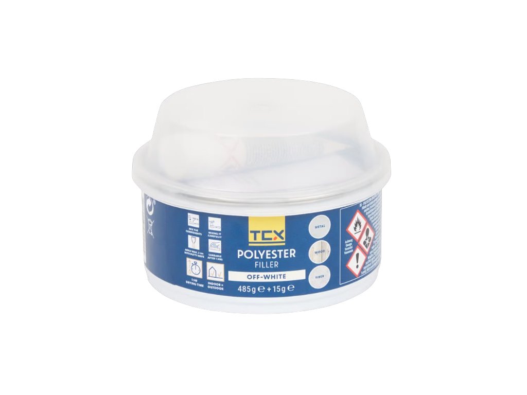 Polyesterový tmel pro srovnání nerovností různých materiálů. Balení obsahuje 2 složky, které se smíchají a špachtli na roztírání hotové směsi. Obsahuje styren.