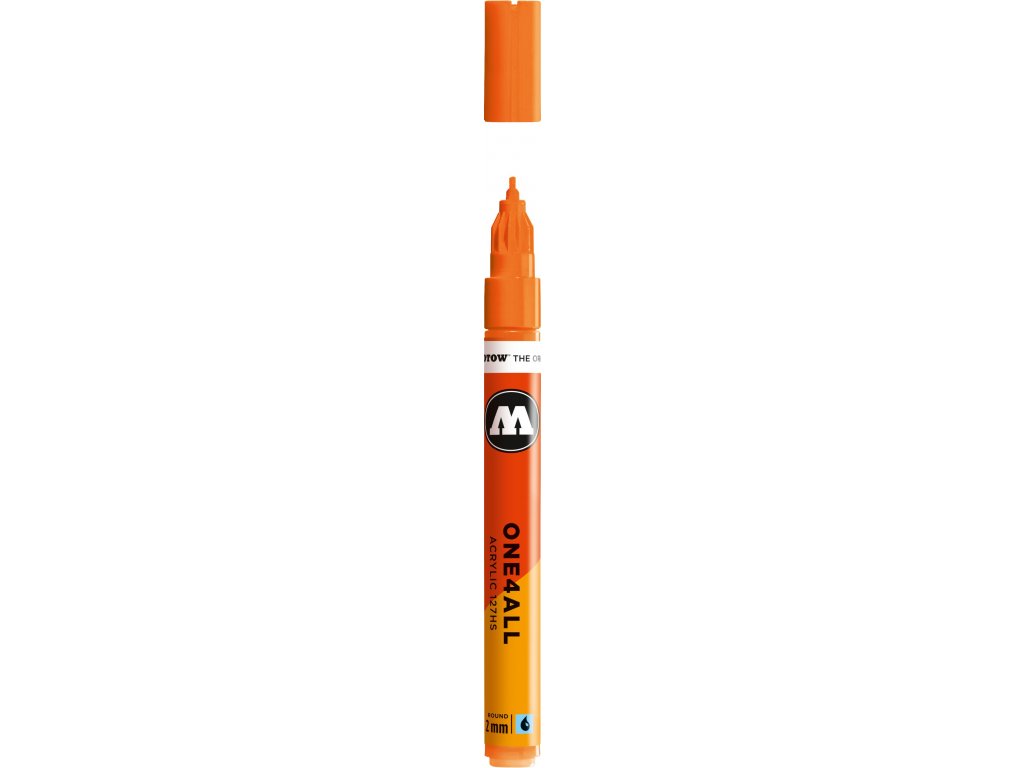 Fix s šířkou hrotu 2 mm německého výrobce Molotow. Náplň je akrylová, pigment je aktivní pod UV světlem a je vhodný na téměř všechny materiály od plastů, přes kov, porcelán, sklo, dřevo, papír, kůži, denim a další textil a díky vodní bázi pigmentu je možné fix použít i na bodypaining. Fixy řady one4all jsou skvělou volbou pro malování na plátna, či nejrůznější předměty (boty, modely, šperky). Díky tenkému hrotu s 2 mm stopou je možné docílit velice jemných tahů a přesných prací. Fix je vybaven optimalizovaným ventilem pro plynulou distribuci barvy do hrotu a vyniká svojí vysokou spolehlivostí. Fix je možné opakovaně naplnit, či k němu dokoupit náhradní hrot. Ředit je možné vodou, či acetonem. Náplň je bez obsahu xylenu a bez zápachu. Fixy této řady lze použít jak v interiéru, tak v exteriéru, kde je pro vyšší odolnost doporučujeme zafixovat bezbarvým lakem.