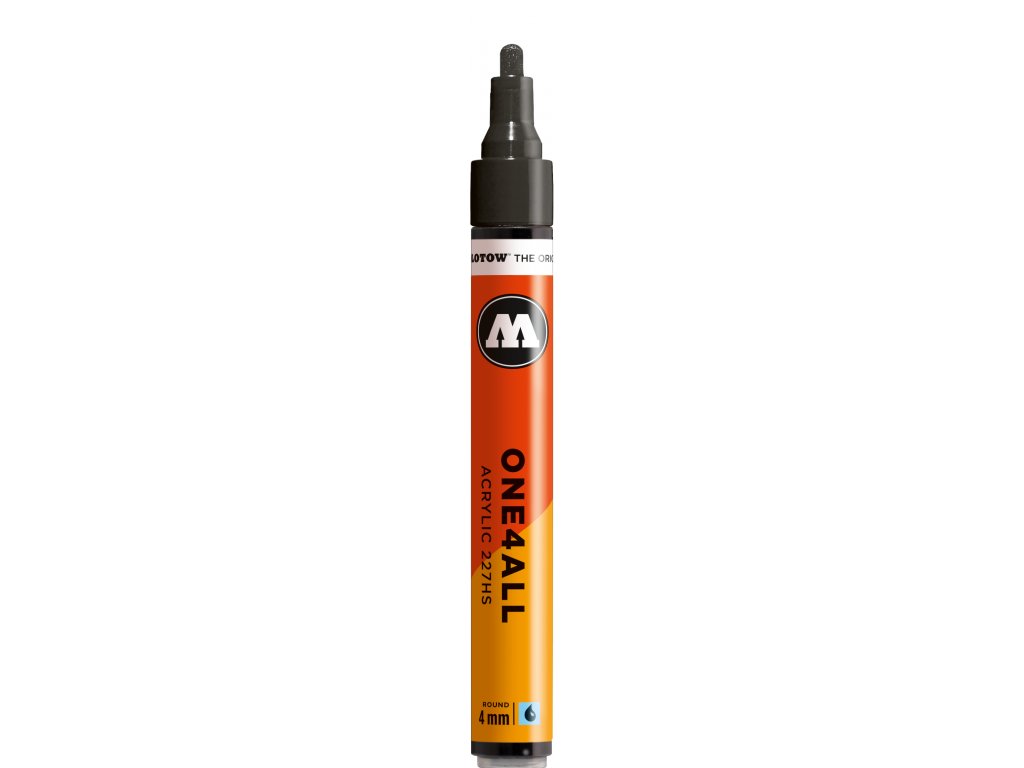 Fix s šířkou hrotu 4 mm německého výrobce Molotow. Náplň je akrylová a je vhodná na téměř všechny materiály od plastů, přes kov, porcelán, sklo, dřevo, papír, kůži, denim a další textil a díky vodní bázi pigmentu je možné fix použít i na bodypaining. Fixy řady one4all jsou skvělou volbou pro malování na plátna, či nejrůznější předměty (boty, modely, šperky). Díky hrotu s 4 mm stopou je možné docílit jemných tahů a přesných prací, ale je vhodný i na pokrytí menším ploch. Fix je vybaven optimalizovaným ventilem pro plynulou distribuci barvy do hrotu a vyniká svojí vysokou spolehlivostí. Fix je možné opakovaně naplnit, či k němu dokoupit náhradní hrot. Ředit je možné vodou, či acetonem. Náplň je bez obsahu xylenu a bez zápachu. Fixy této řady lze použít jak v interiéru, tak v exteriéru, kde je pro vyšší odolnost doporučujeme zafixovat bezbarvým lakem.