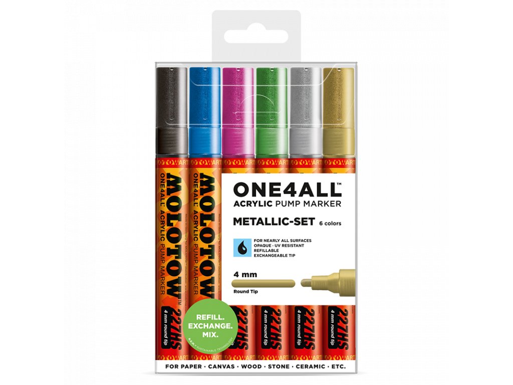 Sada 6ks fixů s šířkou hrotu 4 mm německého výrobce Molotow. Nákup sady je cenově výhodný a nabízí různé barevné varianty setů. Náplň je akrylová, pigment má velice dobré krycí vlastnosti a je vhodný na téměř všechny materiály od plastů, přes kov, porcelán, sklo, dřevo, papír, kůži, denim a další textil a díky vodní bázi pigmentu je možné fix použít i na bodypaining. Fixy řady one4all jsou skvělou volbou pro malování na plátna, či nejrůznější předměty (boty, modely, šperky). Díky hrotu s 4 mm stopou je možné docílit silnějších tahů a fix je vhodný pro pokrytí menších ploch. Barvy navzájem perfektně kryjí a po zaschnutí jsou matné, vodě a oděru odolné. Díky opravdu vysoké koncentraci barevného pigmentu jsou velice kontrastní, zejména na tmavých materiálech a nepropouští světlo. Fix je vybaven optimalizovaným ventilem pro plynulou distribuci barvy do hrotu a vyniká svojí vysokou spolehlivostí. Fix je možné opakovaně naplnit, či k němu dokoupit náhradní hrot. Ředit je možné vodou, či acetonem. Náplň je bez obsahu xylenu a bez zápachu. Fixy této řady lze použít jak v interiéru, tak v exteriéru, kde je pro vyšší odolnost doporučujeme zafixovat bezbarvým lakem.