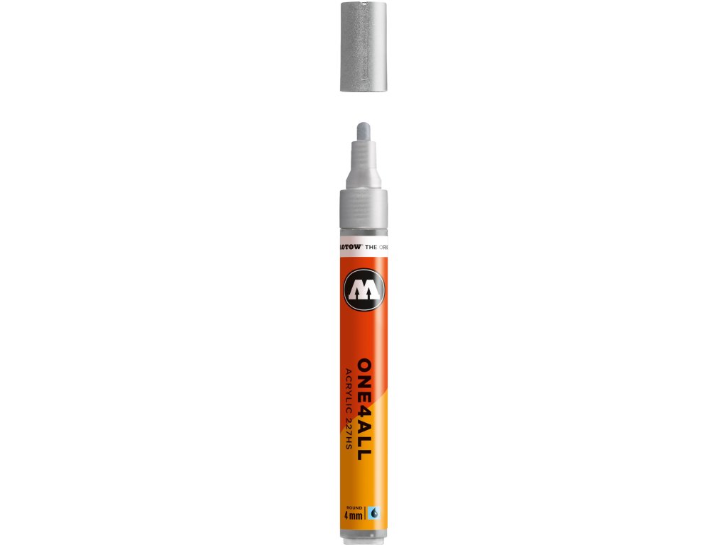 Fix s šířkou hrotu 4 mm německého výrobce Molotow. Náplň je akrylová, pigment je s kovovým, metalicým vzhledem a je vhodný na téměř všechny materiály od plastů, přes kov, porcelán, sklo, dřevo, papír, kůži, denim a další textil a díky vodní bázi pigmentu je možné fix použít i na bodypaining. Fixy řady one4all jsou skvělou volbou pro malování na plátna, či nejrůznější předměty (boty, modely, šperky). Díky hrotu s 4 mm stopou je možné docílit jemných tahů a přesných prací, ale je vhodný i na pokrytí menším ploch. Fix je vybaven optimalizovaným ventilem pro plynulou distribuci barvy do hrotu a vyniká svojí vysokou spolehlivostí. Fix je možné opakovaně naplnit, či k němu dokoupit náhradní hrot. Ředit je možné vodou, či acetonem. Náplň je bez obsahu xylenu a bez zápachu. Fixy této řady lze použít jak v interiéru, tak v exteriéru, kde je pro vyšší odolnost doporučujeme zafixovat bezbarvým lakem.