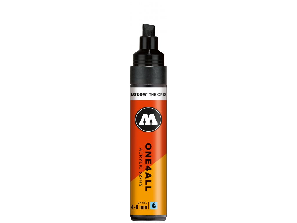 Fix se zkoseným hrotem 8 mm německého výrobce Molotow. Náplň je akrylová, pigment má velice dobré krycí vlastnosti a je vhodný na téměř všechny materiály od plastů, přes kov, porcelán, sklo, dřevo, papír, kůži, denim a další textil a díky vodní bázi pigmentu je možné fix použít i na bodypaining. Fixy řady one4all jsou skvělou volbou pro malování na plátna, či nejrůznější předměty (boty, modely, šperky). Díky zkosenému hrotu s 8 mm stopou je možné docílit velice přesných tahů a je vhodný například na kaligrafii, tagy, nebo pokrytí větších ploch. Barvy navzájem perfektně kryjí a po zaschnutí jsou matné, vodě a oděru odolné. Fix je vybaven optimalizovaným ventilem pro plynulou distribuci barvy do hrotu a vyniká svojí vysokou spolehlivostí. Fix je možné opakovaně naplnit, či k němu dokoupit náhradní hrot. Ředit je možné vodou, či acetonem. Náplň je bez obsahu xylenu a bez zápachu. Fixy této řady lze použít jak v interiéru, tak v exteriéru, kde je pro vyšší odolnost doporučujeme zafixovat bezbarvým lakem.