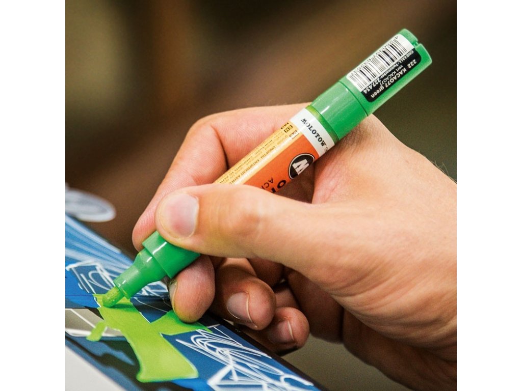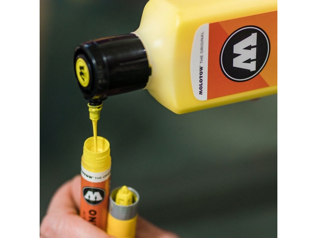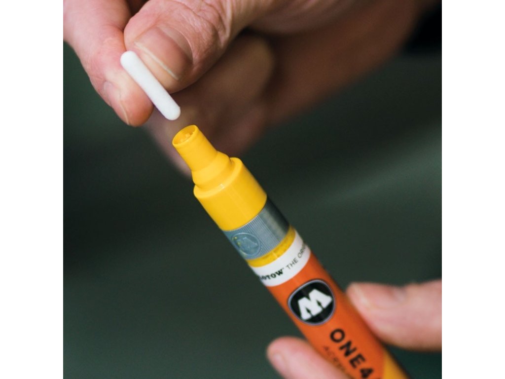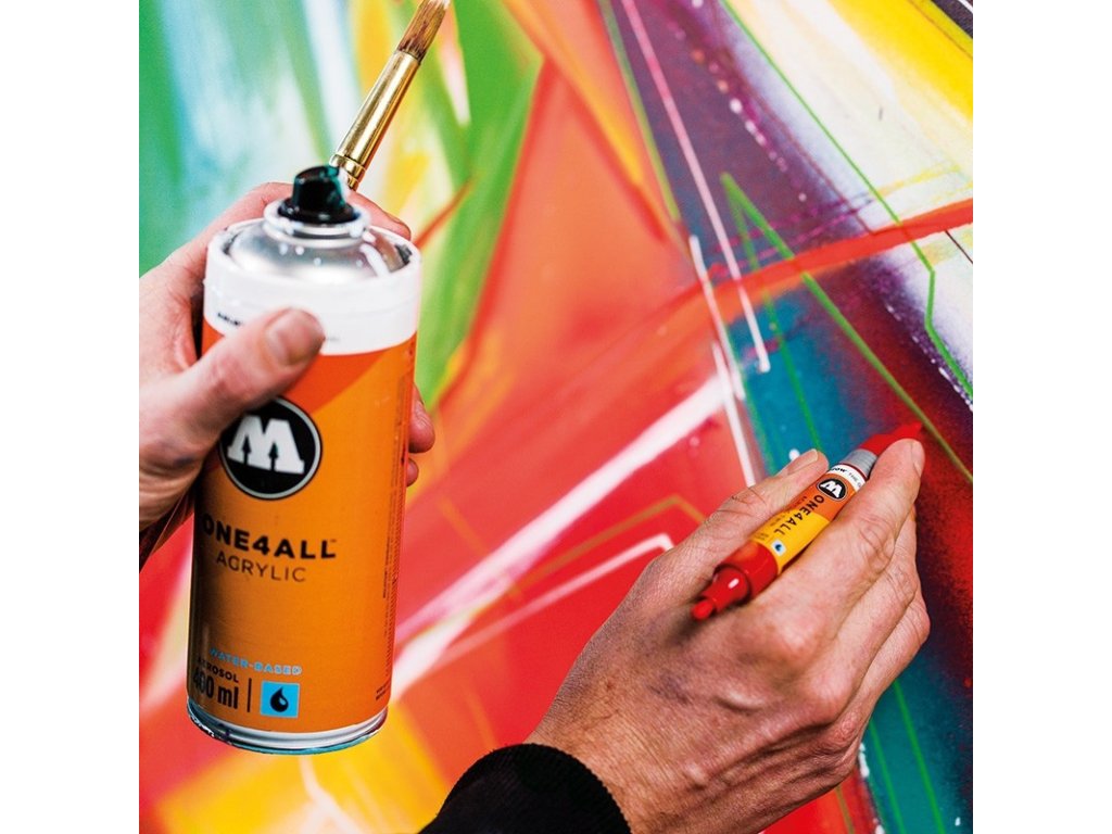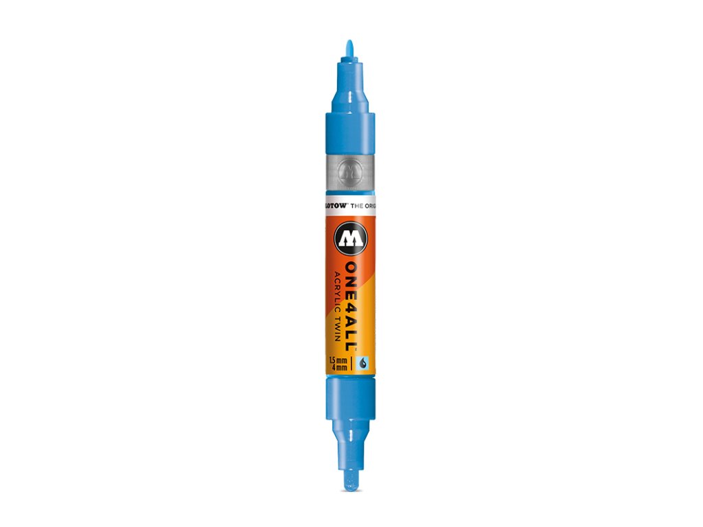 Oboustranný fix s šířkou hrotu 1,5 mm na jedné straně a 4 mm na druhé straně od německého výrobce Molotow. V této produktové variantě je v nabídce 48 odstínů. Náplň je akrylová, pigment má velice dobré krycí vlastnosti a je vhodný na téměř všechny materiály od plastů, přes kov, porcelán, sklo, dřevo, papír, kůži, denim a další textil a díky vodní bázi pigmentu je možné fix použít i na bodypaining. Fixy řady one4all jsou skvělou volbou pro malování na plátna, či nejrůznější předměty (boty, modely, šperky). Díky oboustrannému systému je možné s 1,5 mm stopou docílit velice jemných tahů a přesných prací a s 4 mm stopou vyplňovat větší plochy. Barvy navzájem perfektně kryjí a po zaschnutí jsou matné, vodě a oděru odolné. Díky opravdu vysoké koncentraci barevného pigmentu jsou velice kontrastní, zejména na tmavých materiálech a nepropouští světlo. Fix je vybaven optimalizovaným ventilem pro plynulou distribuci barvy do hrotu a vyniká svojí vysokou spolehlivostí. Fix je vybaven speciální redukcí pro pohodlnější plnění a je možné k němu dokoupit náhradní hrot. Ředit je možné vodou, či acetonem. Náplň je bez obsahu xylenu a bez zápachu. Fixy této řady lze použít jak v interiéru, tak v exteriéru, kde je pro vyšší odolnost doporučujeme zafixovat bezbarvým lakem.