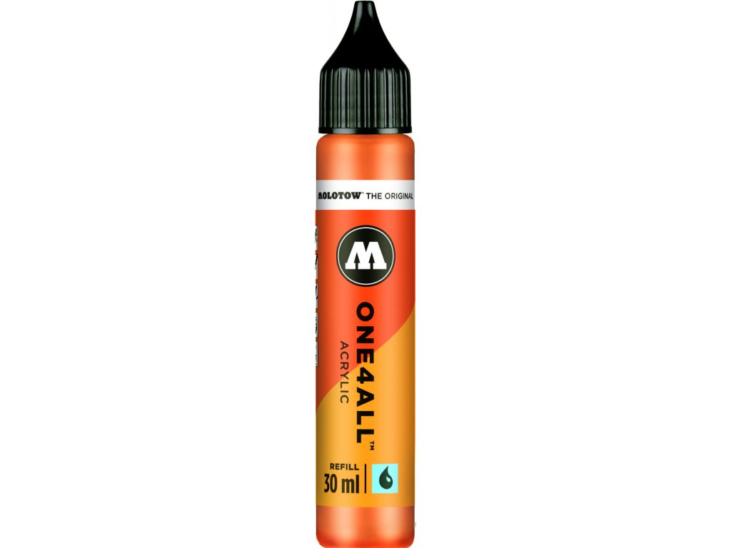 Náplň aktivní pod UV světlem v objemu 30ml od německého výrobce Molotow. Náplň je akrylová a vhodná na téměř všechny materiály od plastů, přes kov, porcelán, sklo, dřevo, papír, kůži, denim a další textil a díky vodní bázi pigmentu je možné náplň použít i na bodypaining. Náplně řady one4all jsou skvělou volbou pro malování na plátna, či nejrůznější předměty (boty, modely, šperky). Barvy jsou po zaschnutí matné, vodě a oděru odolné. Náplň je bez obsahu xylenu a bez zápachu. Náplně této řady lze použít jak v interiéru, tak v exteriéru, kde je pro vyšší odolnost doporučujeme zafixovat bezbarvým lakem.