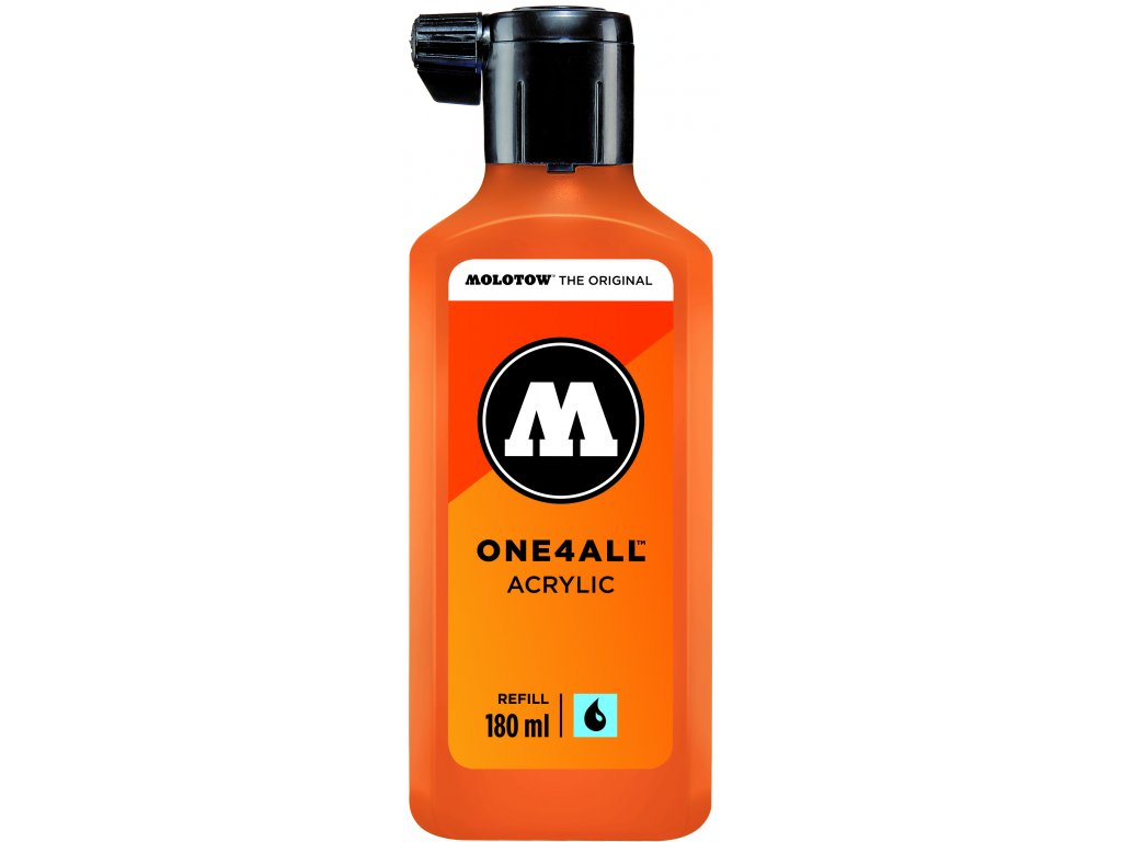Náplň aktivní pod UV světlem v objemu 180ml od německého výrobce Molotow. Náplň je akrylová a vhodná na téměř všechny materiály od plastů, přes kov, porcelán, sklo, dřevo, papír, kůži, denim a další textil a díky vodní bázi pigmentu je možné náplň použít i na bodypaining. Náplně řady one4all jsou skvělou volbou pro malování na plátna, či nejrůznější předměty (boty, modely, šperky). Barvy jsou po zaschnutí matné, vodě a oděru odolné. Náplň je bez obsahu xylenu a bez zápachu. Náplně této řady lze použít jak v interiéru, tak v exteriéru, kde je pro vyšší odolnost doporučujeme zafixovat bezbarvým lakem.