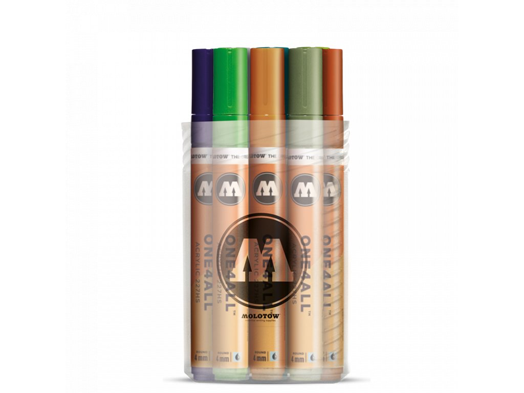 Sada 12 ks fixů s šířkou hrotu 4 mm německého výrobce Molotow. Nákup sady je cenově výhodný a nabízí různé barevné varianty setů. Náplň je akrylová, pigment má velice dobré krycí vlastnosti a je vhodný na téměř všechny materiály od plastů, přes kov, porcelán, sklo, dřevo, papír, kůži, denim a další textil a díky vodní bázi pigmentu je možné fix použít i na bodypaining. Fixy řady one4all jsou skvělou volbou pro malování na plátna, či nejrůznější předměty (boty, modely, šperky). Díky hrotu s 4 mm stopou je možné docílit silnějších tahů a fix je vhodný pro pokrytí menších ploch. Barvy navzájem perfektně kryjí a po zaschnutí jsou matné, vodě a oděru odolné. Díky opravdu vysoké koncentraci barevného pigmentu jsou velice kontrastní, zejména na tmavých materiálech a nepropouští světlo. Fix je vybaven optimalizovaným ventilem pro plynulou distribuci barvy do hrotu a vyniká svojí vysokou spolehlivostí. Fix je možné opakovaně naplnit, či k němu dokoupit náhradní hrot. Ředit je možné vodou, či acetonem. Náplň je bez obsahu xylenu a bez zápachu. Fixy této řady lze použít jak v interiéru, tak v exteriéru, kde je pro vyšší odolnost doporučujeme zafixovat bezbarvým lakem.