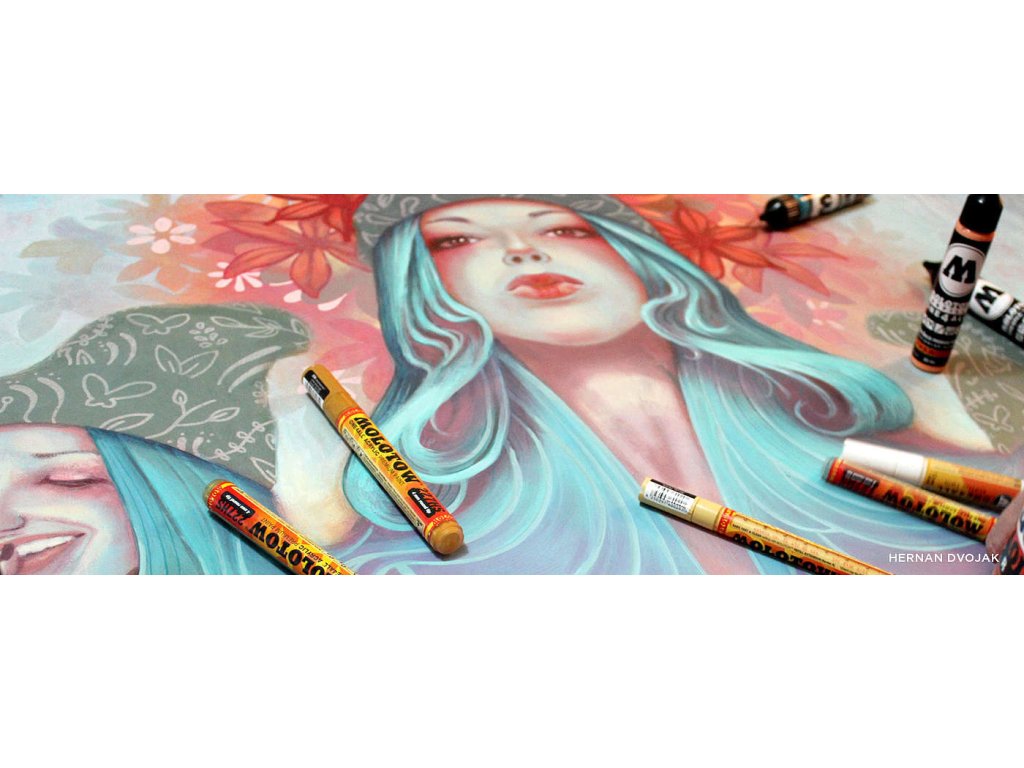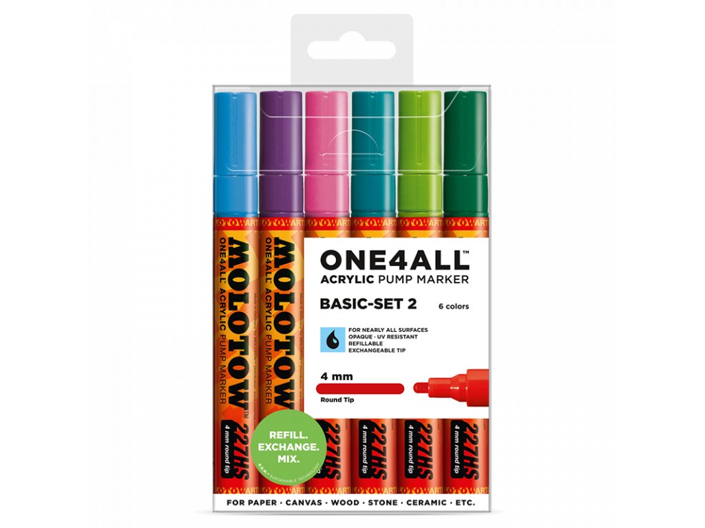 Sada 6ks fixů s šířkou hrotu 4 mm německého výrobce Molotow. Nákup sady je cenově výhodný a nabízí různé barevné varianty setů. Náplň je akrylová, pigment má velice dobré krycí vlastnosti a je vhodný na téměř všechny materiály od plastů, přes kov, porcelán, sklo, dřevo, papír, kůži, denim a další textil a díky vodní bázi pigmentu je možné fix použít i na bodypaining. Fixy řady one4all jsou skvělou volbou pro malování na plátna, či nejrůznější předměty (boty, modely, šperky). Díky hrotu s 4 mm stopou je možné docílit silnějších tahů a fix je vhodný pro pokrytí menších ploch. Barvy navzájem perfektně kryjí a po zaschnutí jsou matné, vodě a oděru odolné. Díky opravdu vysoké koncentraci barevného pigmentu jsou velice kontrastní, zejména na tmavých materiálech a nepropouští světlo. Fix je vybaven optimalizovaným ventilem pro plynulou distribuci barvy do hrotu a vyniká svojí vysokou spolehlivostí. Fix je možné opakovaně naplnit, či k němu dokoupit náhradní hrot. Ředit je možné vodou, či acetonem. Náplň je bez obsahu xylenu a bez zápachu. Fixy této řady lze použít jak v interiéru, tak v exteriéru, kde je pro vyšší odolnost doporučujeme zafixovat bezbarvým lakem.