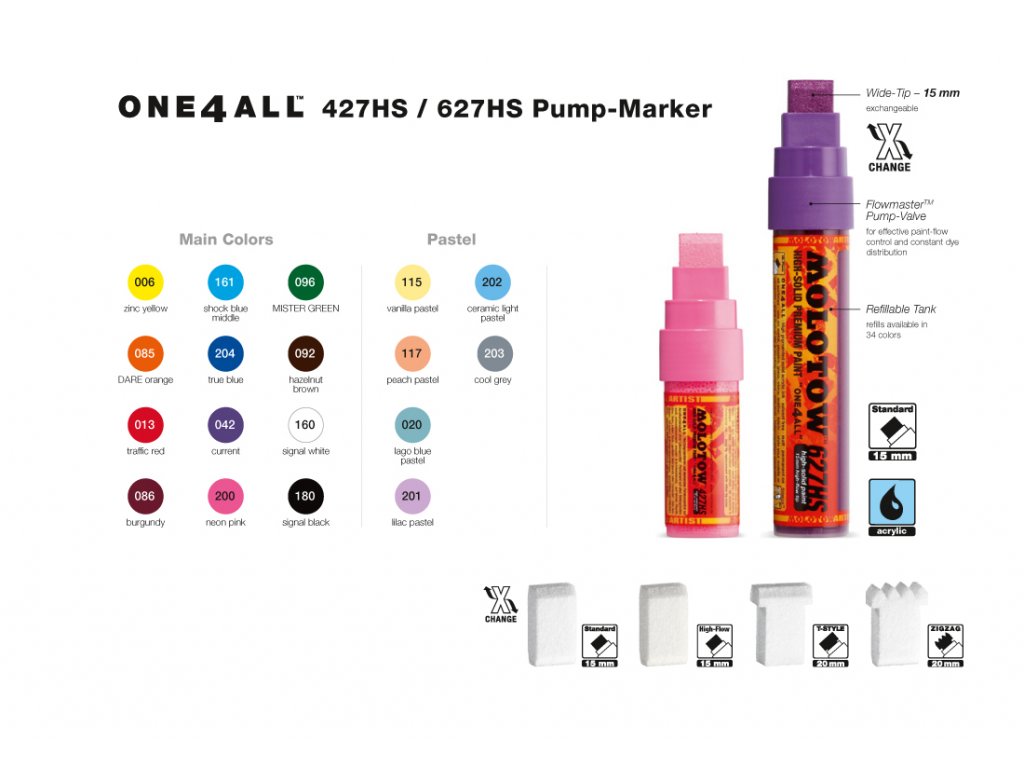 Fix s šířkou hrotu 15 mm německého výrobce Molotow. V této produktové variantě je v nabídce 18 odstínů. Náplň je akrylová, pigment má velice dobré krycí vlastnosti a je vhodný na téměř všechny materiály od plastů, přes kov, porcelán, sklo, dřevo, papír, kůži, denim a další textil a díky vodní bázi pigmentu je možné fix použít i na bodypaining. Fixy řady one4all jsou skvělou volbou pro malování na plátna, či nejrůznější předměty (boty, modely, šperky). Díky hrotu s 15 mm stopou je možné docílit silných tahů, takže je fix vhodný například pro kaligrafii, tagy, či pokrytí velkých ploch. Barvy navzájem perfektně kryjí a po zaschnutí jsou matné, vodě a oděru odolné. Díky opravdu vysoké koncentraci barevného pigmentu jsou velice kontrastní, zejména na tmavých materiálech a nepropouští světlo. Fix je vybaven optimalizovaným ventilem pro plynulou distribuci barvy do hrotu a vyniká svojí vysokou spolehlivostí. Fix je možné opakovaně naplnit, či k němu dokoupit náhradní hrot. Ředit je možné vodou, či acetonem. Náplň je bez obsahu xylenu a bez zápachu. Fixy této řady lze použít jak v interiéru, tak v exteriéru, kde je pro vyšší odolnost doporučujeme zafixovat bezbarvým lakem.