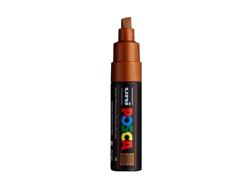 UNI Posca PC-8k japonského výrobce UNI. Fix se seříznutým hrotem šíře 8 mm. Náplň je akrylová, tedy na vodní bázi. Po zaschnutí je pigment vodě i povětrnostním vlivům odolný a je tedy ho možné použít jak v interiéru, tak exteriéru. Skvělé využití mají tyto fixy při tvorbě na papír, stopa může být trvalá na terakotě (po fixaci pečením na 220 stupňů 45 min), porcelán a sklo (po fixaci pečením na 160 stupňů 45 min a následným přelakováním čirým lakem), textil (po zažehlení z rubové strany), kov, plast, dřevo, plasty a další materiály. Akrylový lak má velmi dobré krycí vlastnosti s matným výsledným efektem. Barva je netoxická a tedy vhodná i na bodypainting. Díky seříznutému hrotu u těchto fixů je fix vhodný například pro kaligrafii, tagy, nebo pokrývání větších ploch.