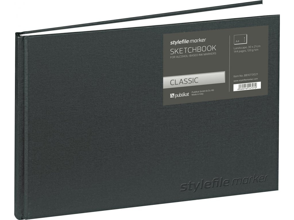 Sketch book od německé značky Stylefile, který má 144 stran, papír gramáže 120g/m2 a záložku. K dispozici je ve variantě A4 s čistými listy papíru na šířku i na výšku.