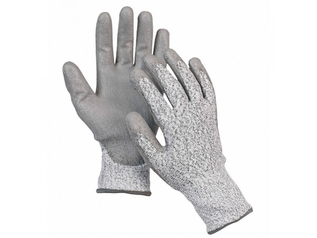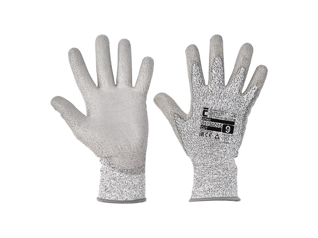 Rukavice STINT jsou pletené, kombinované a protipořezové. Jsou vybaveny pružnou manžetou. Rukavice mají v dlani a na prstech šedý polyuretan. Úroveň odolnosti proti prořezu - 3. Norma: EN 420:2003+A1:2009, EN 388:2003-4342.