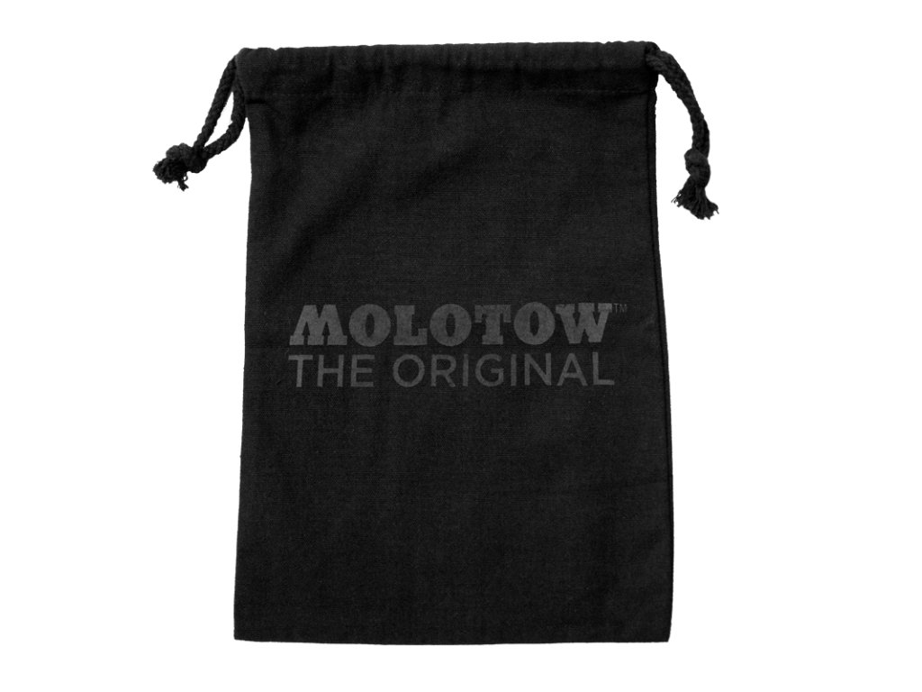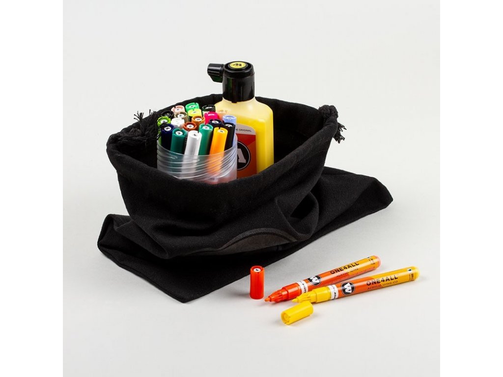 Praktický pytlík na fixy, trysky a další příslušenství od německé značky Molotow. Pytlík je vyroben z pevné, 100% bavlny a je možné ho stáhnout všitou šňůrkou. Z každé strany ma elegatní, černý potisk.