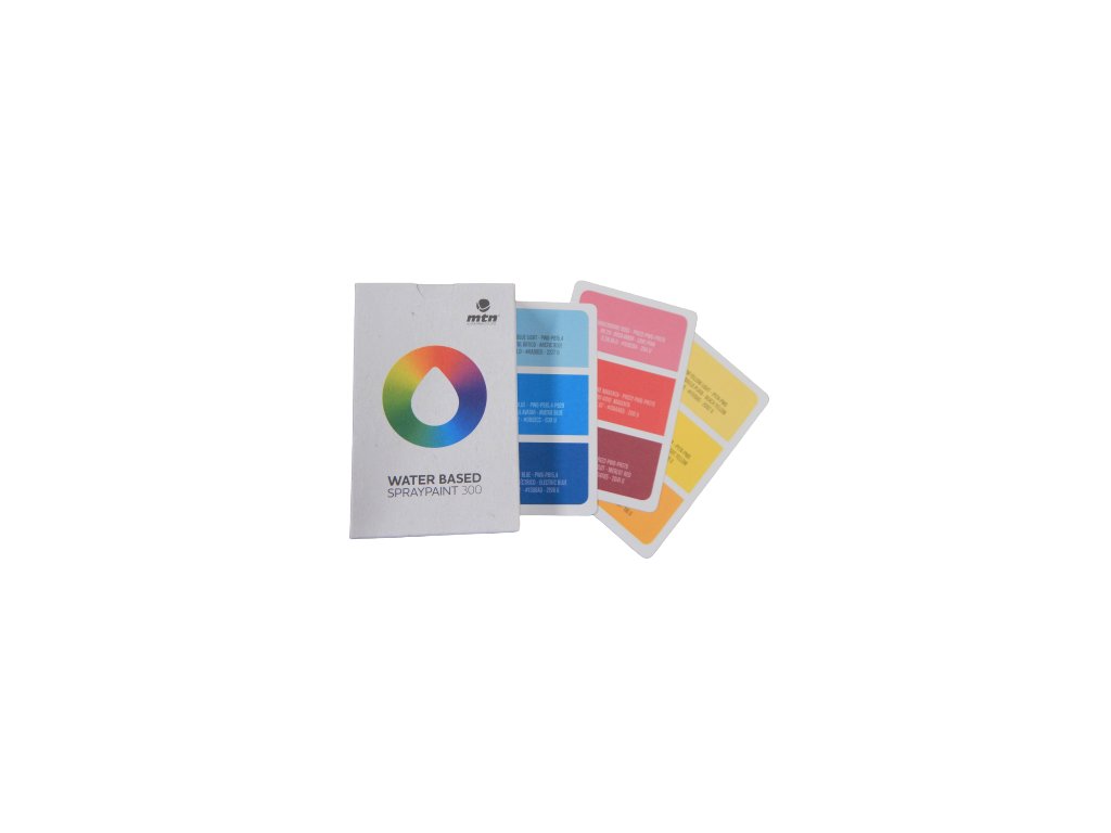 Tištěný vzorník barevných odstínů sprejů značky MTN, řady Water based. Tato vzorkovnice je tvořena samostatnými kartami s trojící odstínů, díky čemuž je možné barvy porovnávat, párovat a celý výběr barev je tak variabilnější.