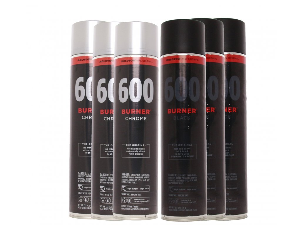Cenově výhodný balíček obsahující 6 ks akčních sprejů Molotow Burner v objemu 600 ml. V balíčku najdete 3 ks chromu a 3 ks černé, které jsou spolu perfektně kompatibilní a zaručují nejvyšší kvalitu kultovního dua "chrom+černá". Chrom má perfektní krytí, neobsahuje kuličky a je vhodný pro rychlé pokrytí velké plochy. Černá Burner má perfektní krycí vlastnosti přes chrom a zůstává 100% černá, tedy nebledne, nebo nemění barvu.