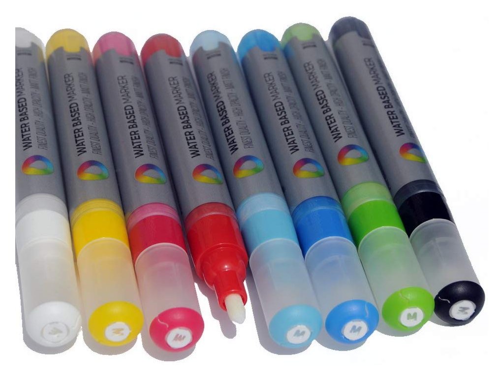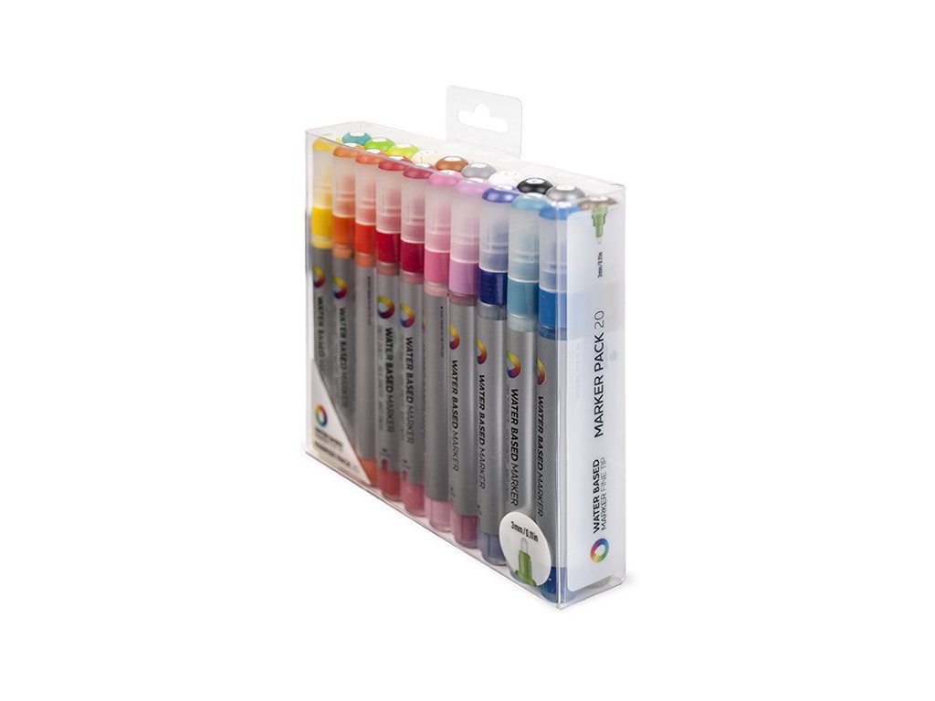 Sada obsahuje akrylové fixy španělského výrobce MTN s tenkým hrotem 3 mm. Fix je vhodný na malby a práce menšího formátu, zdobení a podobně. Náplň fixu je na vodní bázi s perfektním krytím na všech materiálech, jako kov, plast, porcelán, dřevo, plátno, kůže, papír, sklo a další. Pigment je silně koncentrovaný a po svém zachnutí je barva vodě odolná. Náplň je bez zápachu a bez rozpouštědel a je tedy vhodná i pro práci s dětmi. Fix je možné použít v interiéru i exteriéru a v nabídce je 20 kontrastních odstínů, včetně stříbrné a zlaté. Náplň lze opakovaně doplňovat, stejně tak jako je možné vyměnit hrot. Odstíny této řady fixů jsou stejné jako odstíny sprejů MTN Water based 300 ml a je tedy možné je kombinovat při práci aniž by byl ve výsledku znatelný rozdíl barev.